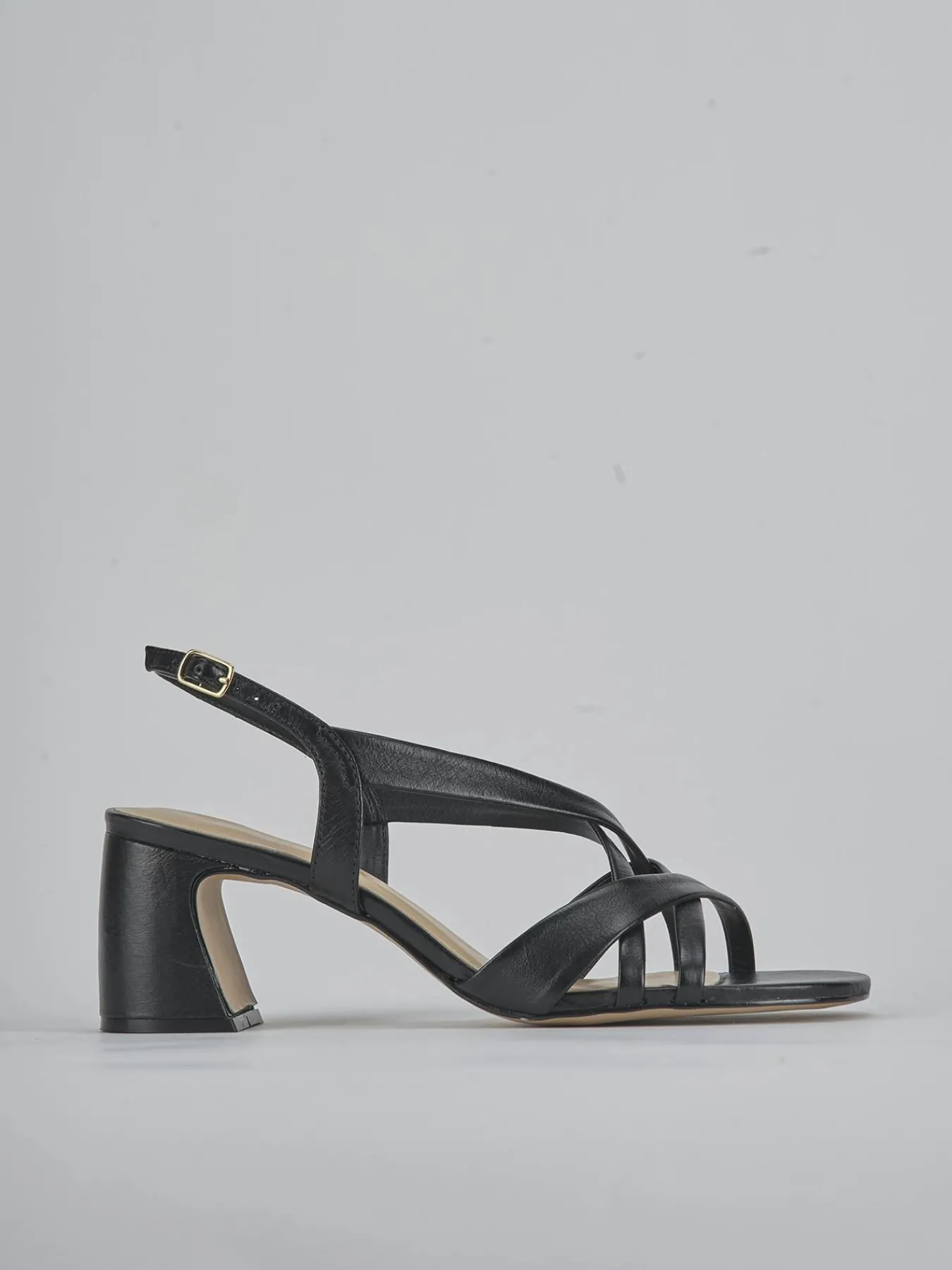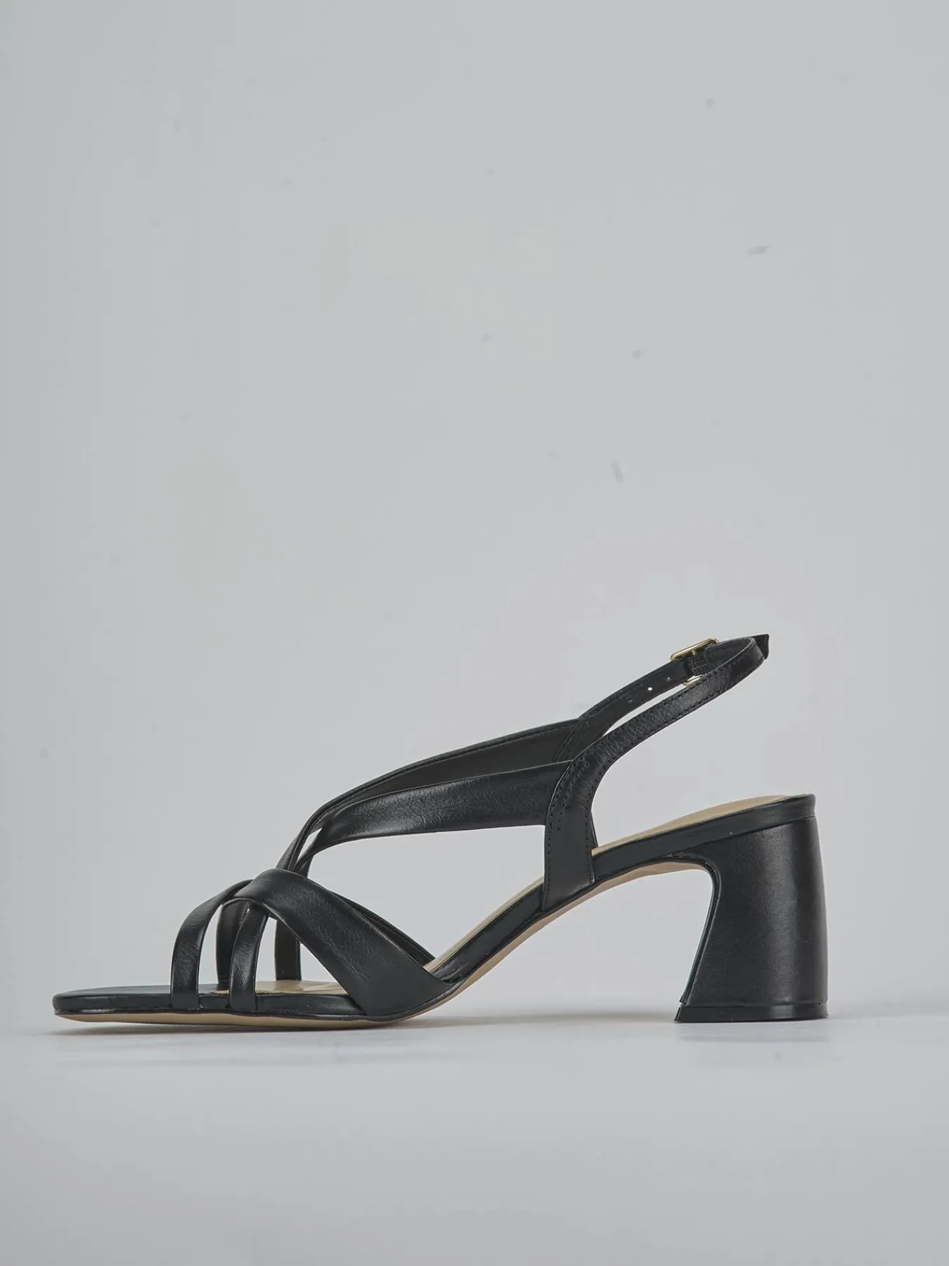 Sandalo tacco 6 cm fondo in leggerissima gomma e soletto interno in vera pelle. Tomaia in morbida pelle, punta leggermente squadrata, fascette incrociate e cinturino con fibbia regolabile e tacco grosso. Dal design che dura nel tempo, perfetto con qualsiasi outfit.