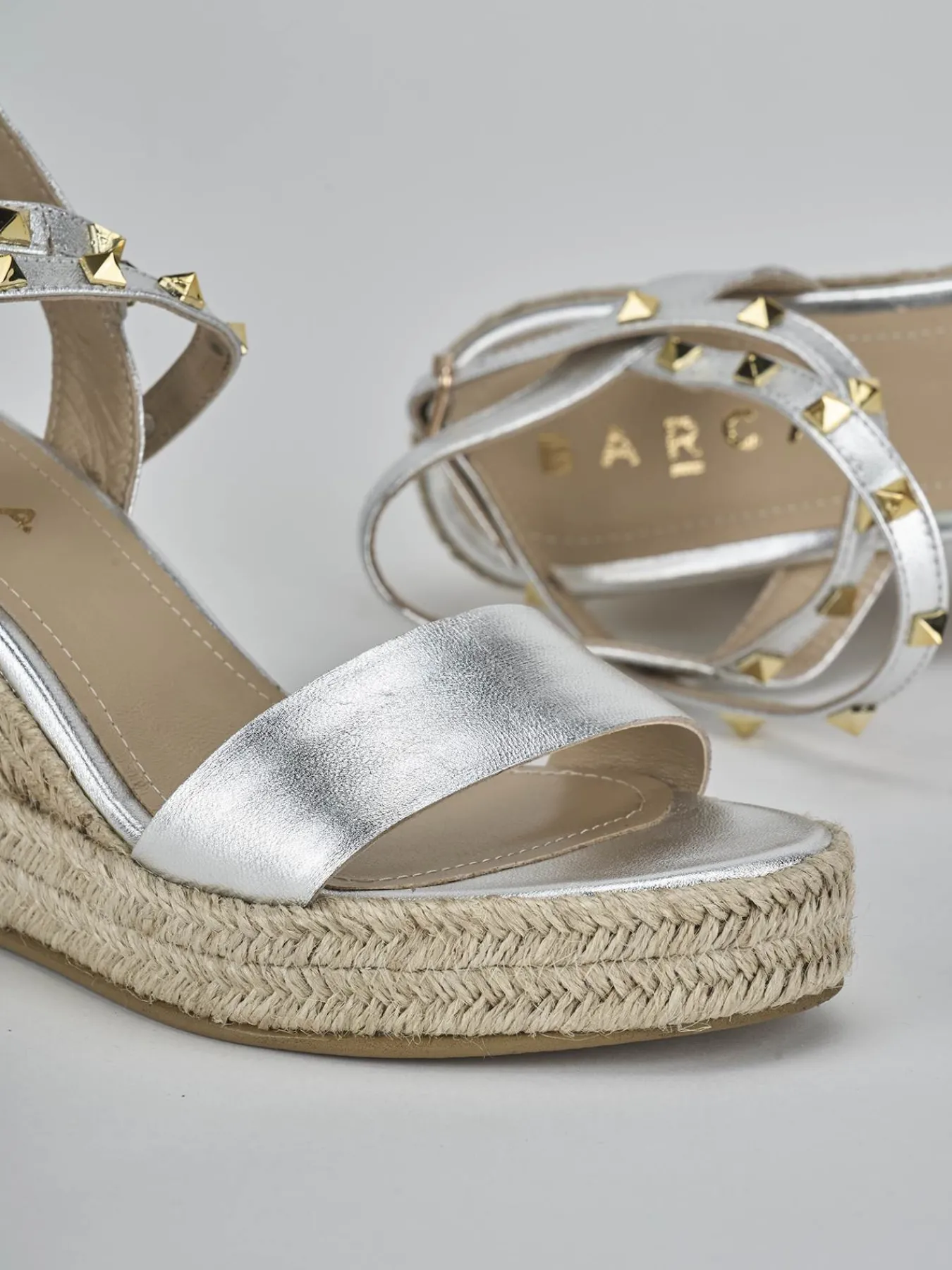 Sandalo zeppa 9 cm fondo in leggerissima gomma e soletto interno in vera pelle. Tomaia in morbida pelle laminata, punta affusolata, fascia unica in punta, cinturini incrociati in caviglia con fibbia regolabile e borchie per un tocco cool ai tuoi look.