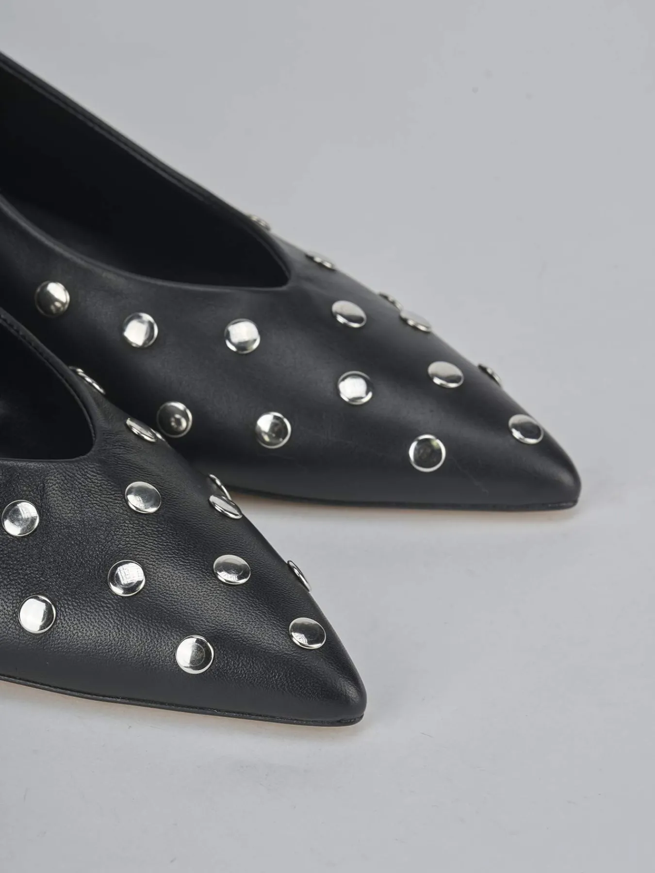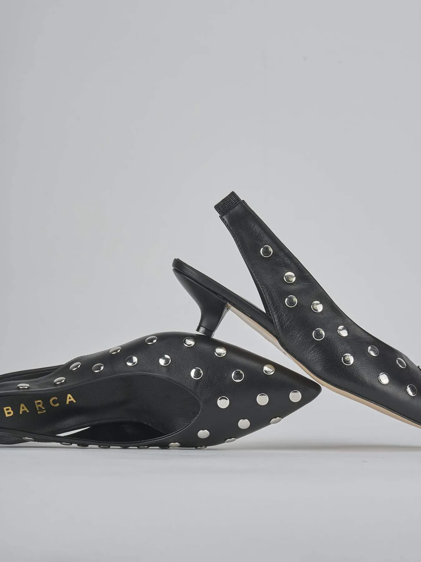 Slingback decolte’ tacco 4 cm fondo in leggerissima gomma e soletto interno in vera pelle. Tomaia in morbida pelle, punta sfilata, scollo a ‘V’, borchie, cinturino elasticizzato che avvolge bene il tallone e nuovissimo tacco rocchetto per un tocco glamour ai tuoi look.