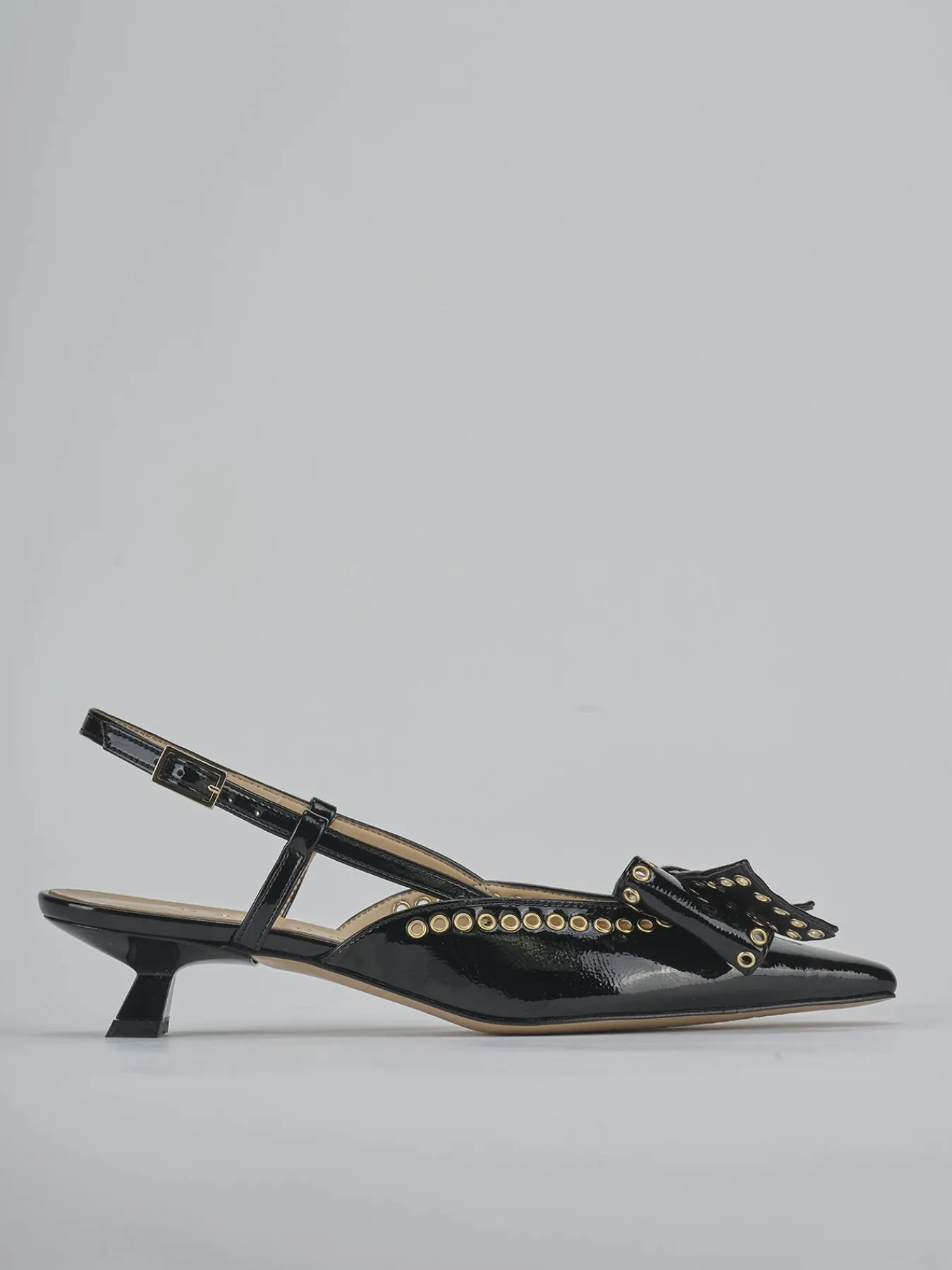 Slingback decolte’ tacco 4 cm fondo in leggerissima gomma e soletto interno in vera pelle. Tomaia in morbida pelle effetto verniciato, punta sfilata, fiocco, borchie forate, cinturino con fibbia regolabile e tacco rocchetto. Perfetto con un vestito lungo.