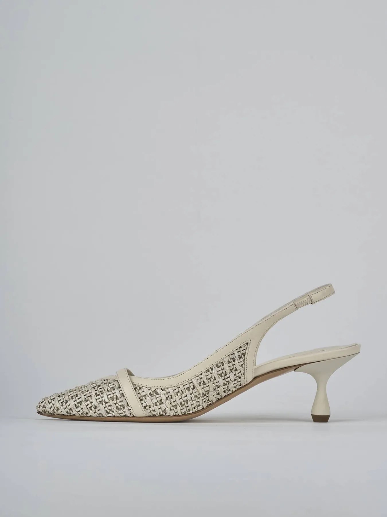 Slingback decolte’ tacco 5 cm fondo in cuoio e soletto interno in vera pelle. Tomaia in morbida pelle foderata in rafia, punta sfilata, scollo a ‘V’ sagomato, bordo rinforzato, cinturino elasticizzato per un fit su misura. Nuovissimo tacco clessidra comodo. Per un look cool.
