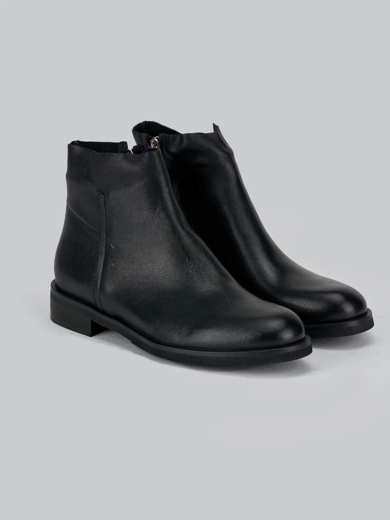 Stivaletto tacco 2 cm fondo in leggera gomma e soletto interno in vera pelle. Tomaia in morbido camoscio, punta arrotondata, cuciture a vista, cerniera laterale e tacco solido. Perfetto sia con dei jeans che con una gonna midi.