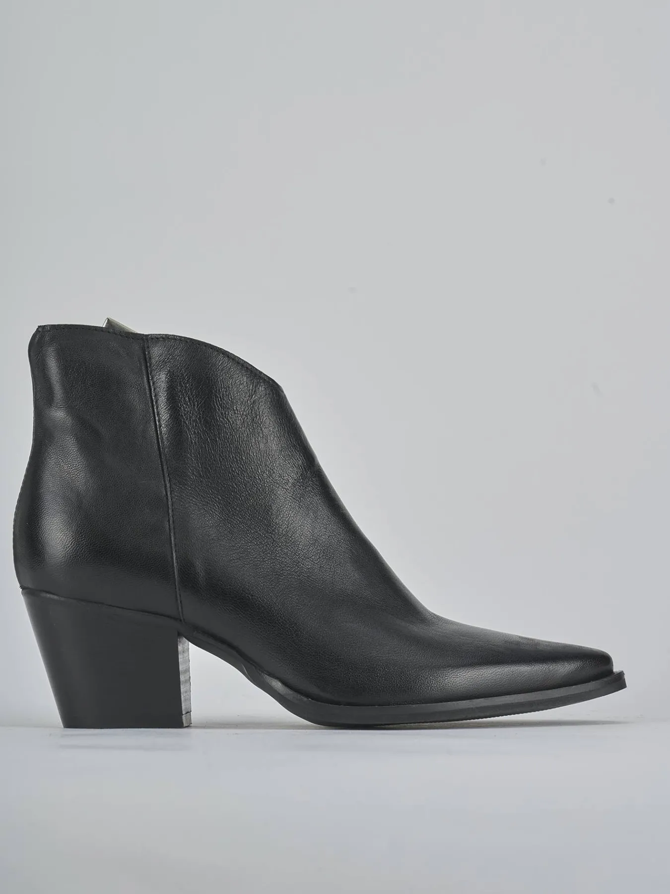 Stivaletto tacco 6 cm fondo in gomma e soletto interno in vera pelle. Tomaia in morbida pelle, punta sfilata, cuciture a mano, apertura davanti a ‘V’, comoda cerniera laterale e tacco grosso. Guardolo sporgente con piccole borchie, per un tocco fierce ai tuoi look.