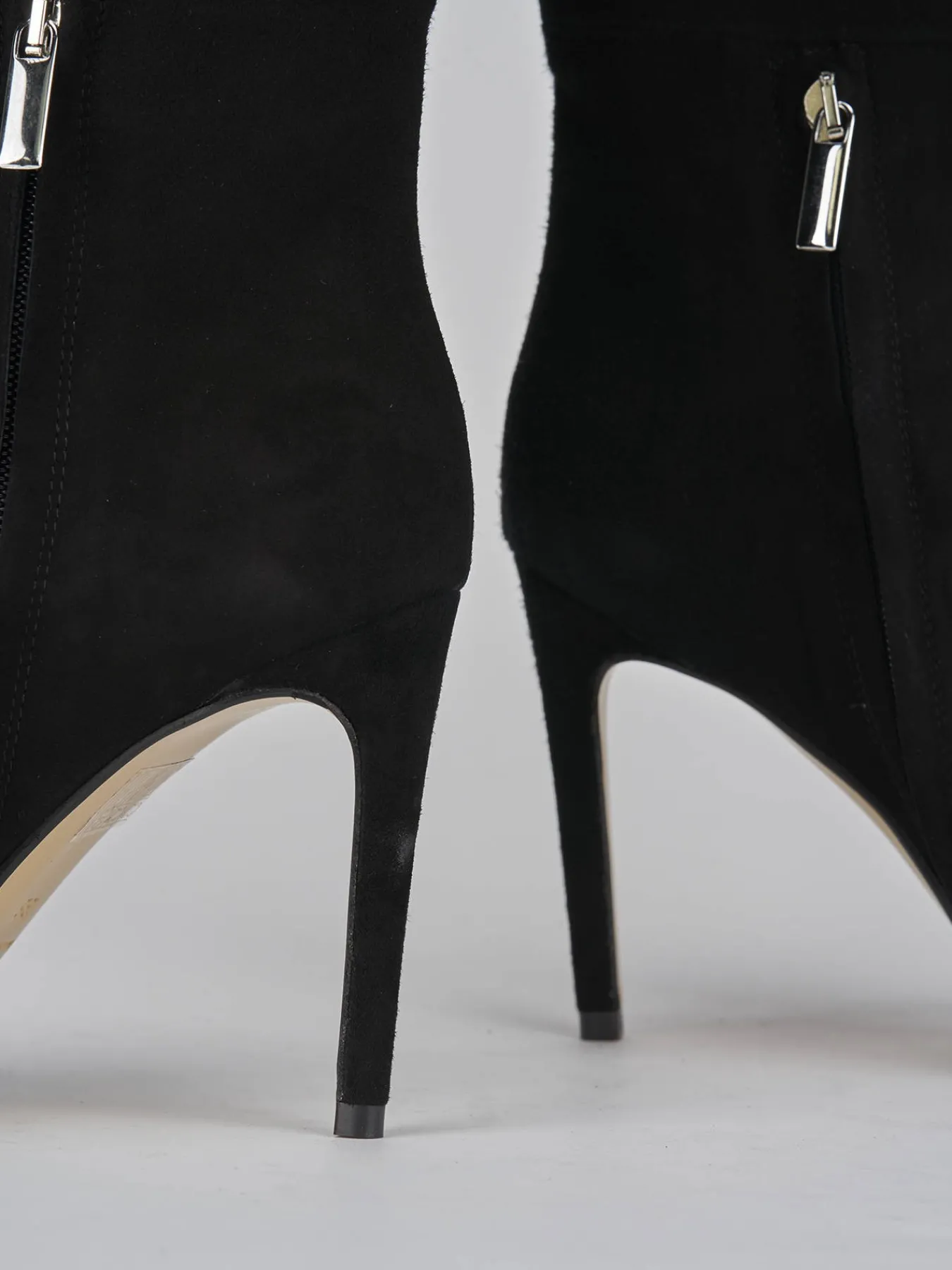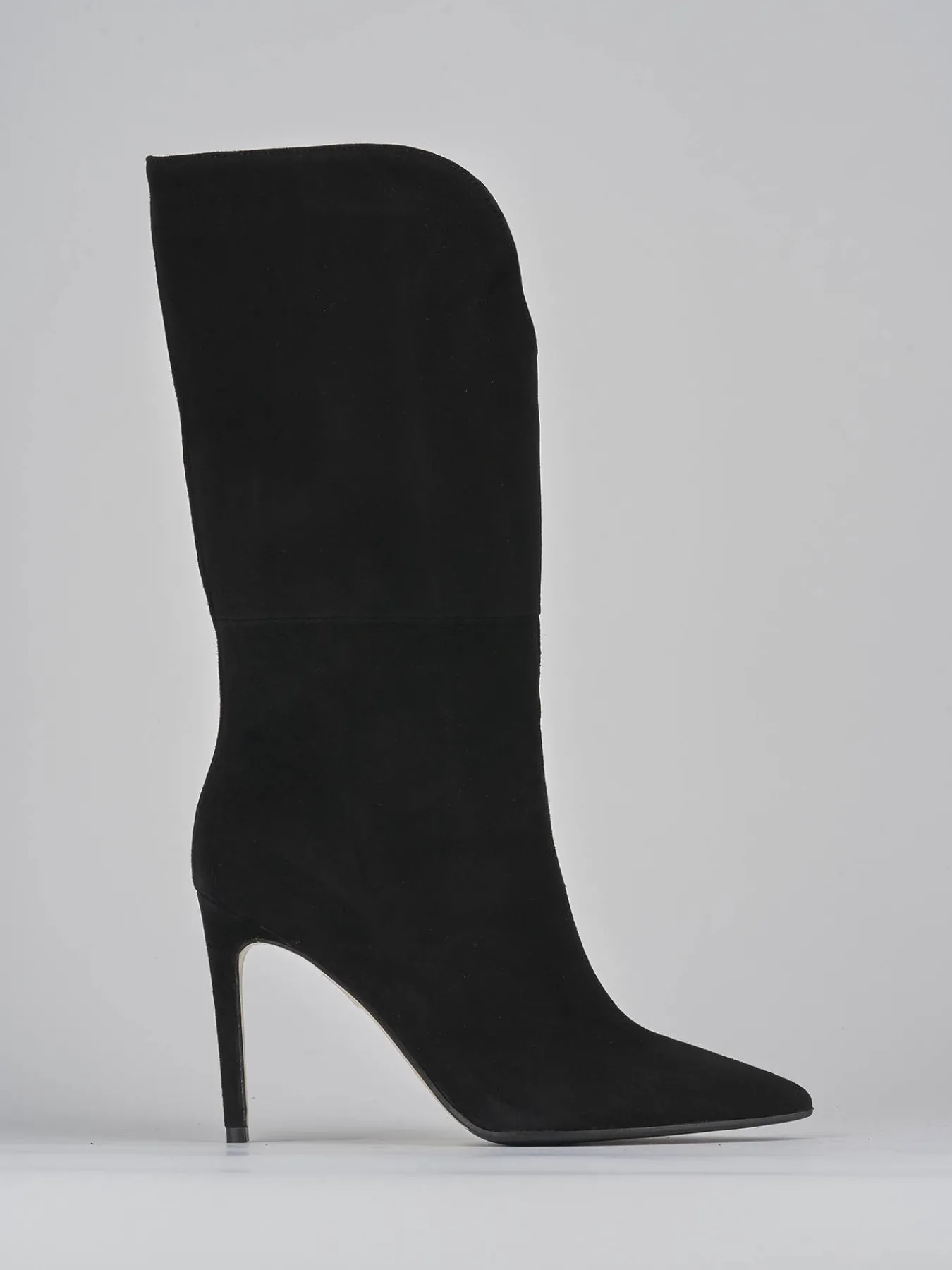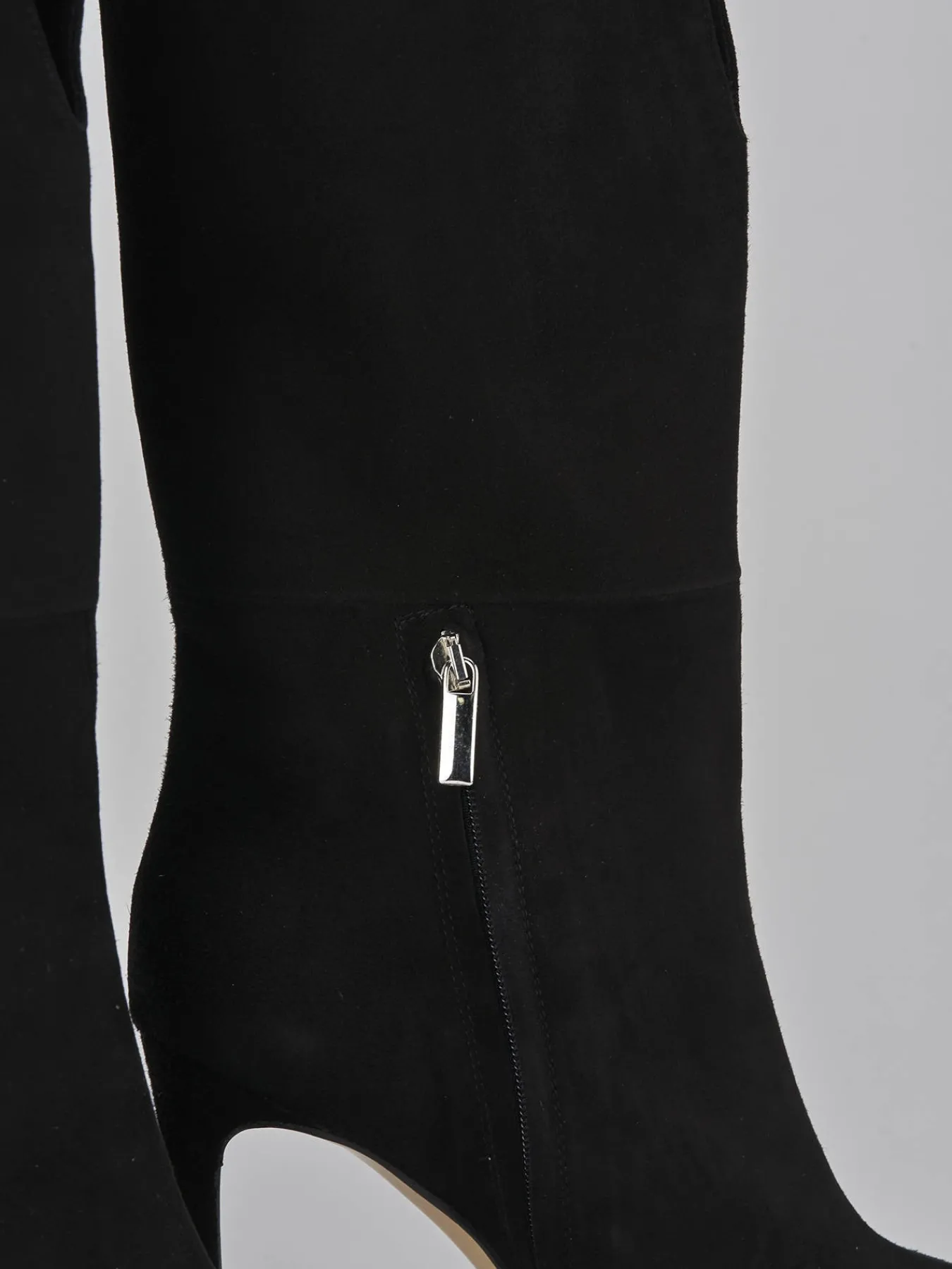 Stivale tacco 11 cm fondo in cuoio e soletto interno in vera pelle. Tomaia in morbido camoscio, punta sfilata, gambale con risvolto che arriva appena sotto al ginocchio con apertura centrale a “V”, comoda cerniera laterale e tacco a spillo per un look chic.