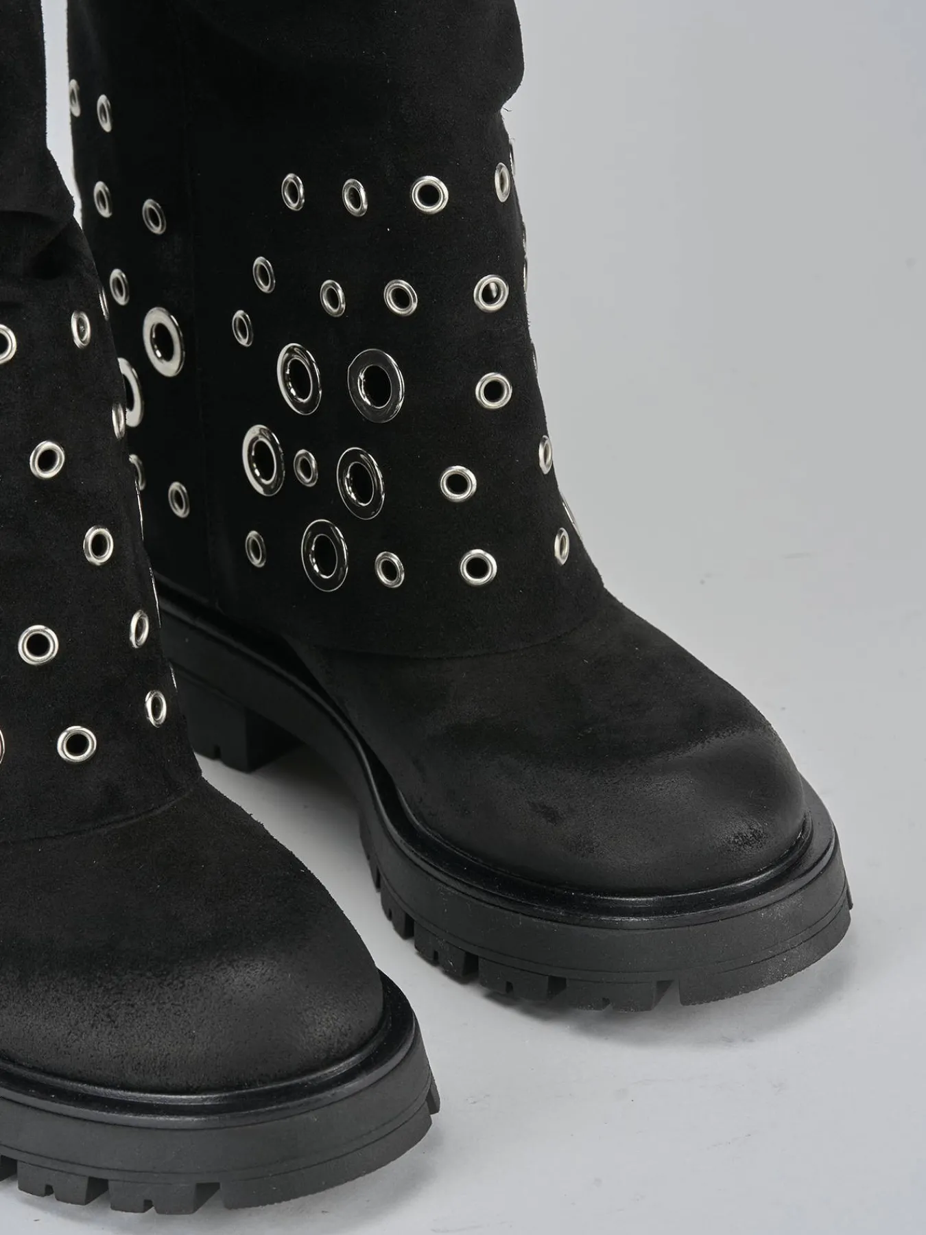 Il gambale a tre quarti del polpaccio è arricchito da un risvolto con borchie in metallo, aggiungendo un tocco di grinta al tuo outfit.