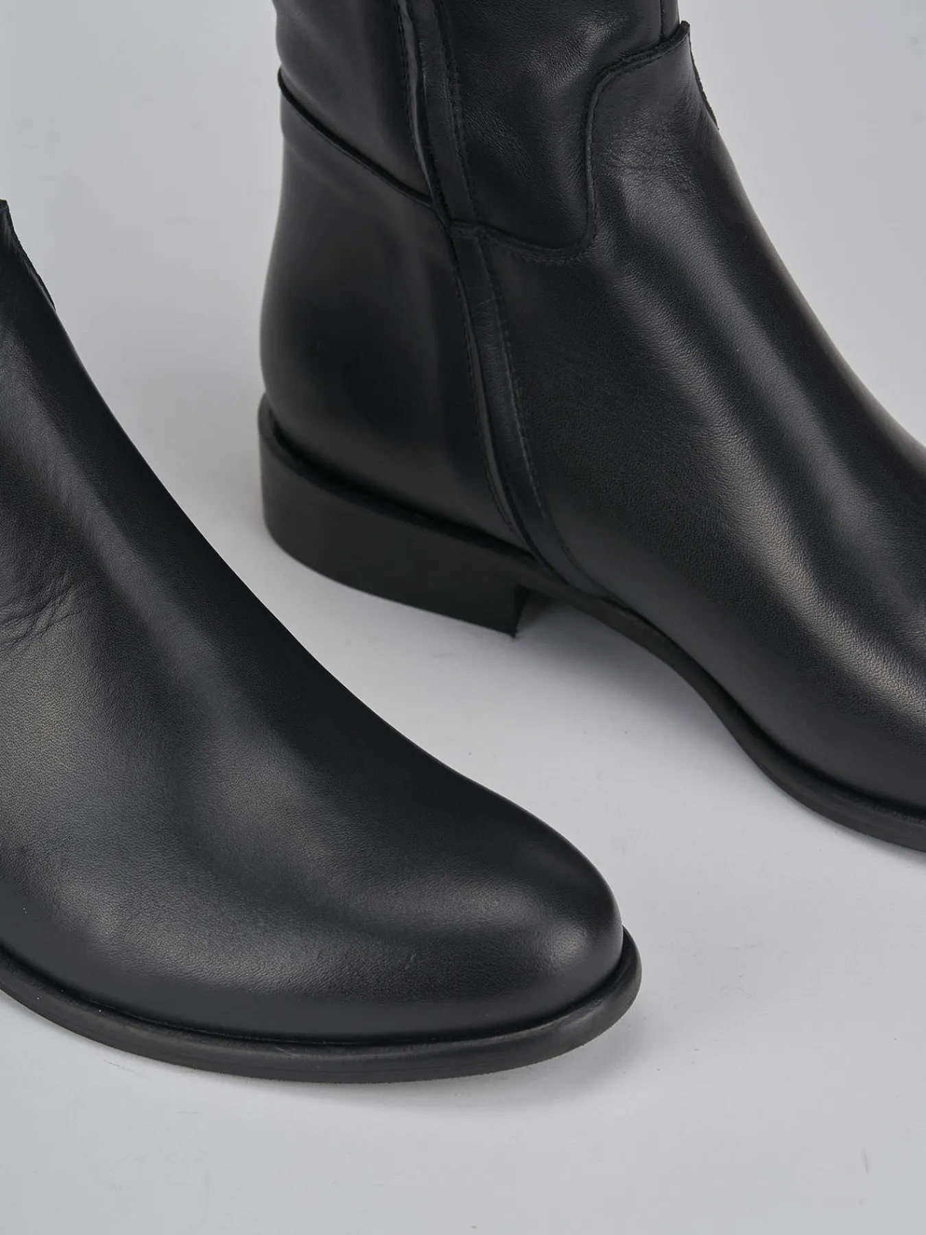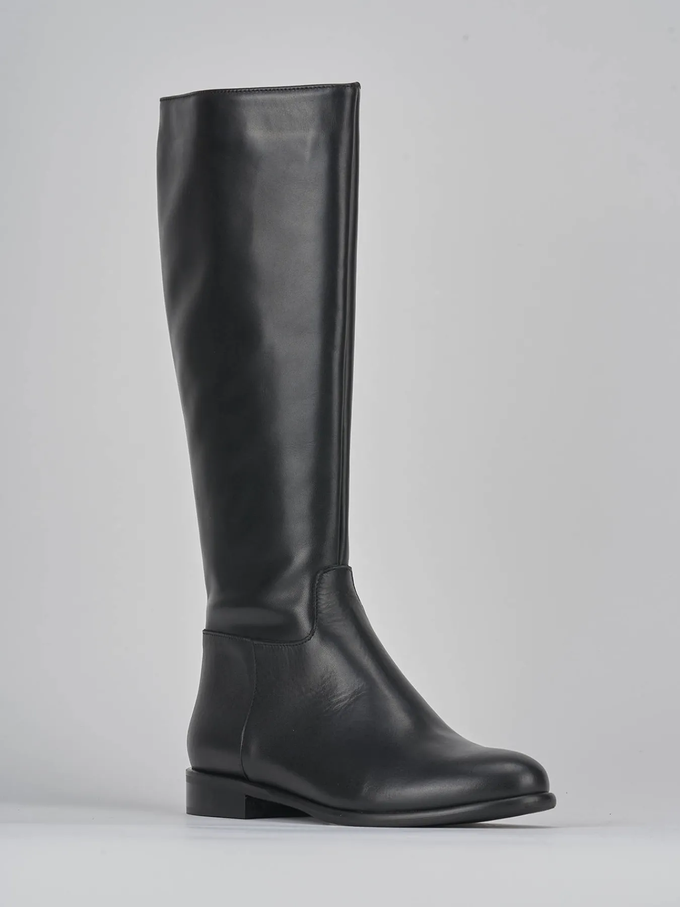 Stivale tacco 2 cm fondo in gomma e soletto interno in vera pelle. Tomaia in morbida pelle, punta tonda, gambale a tubo con altezza fino a sotto il ginocchio e comoda cerniera laterale per un look che non passa mai di moda. Comodo anche per polpacci generosi