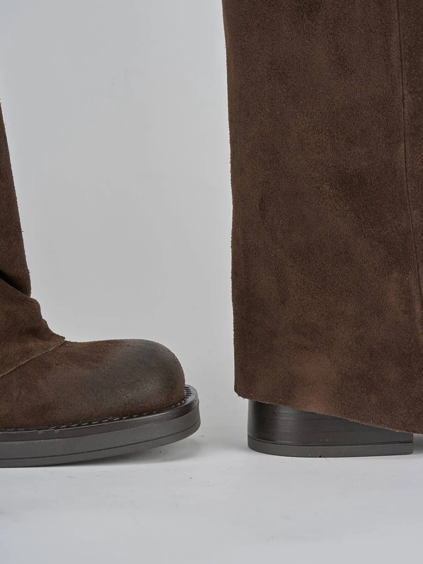 La tomaia è arricciata con un risvolto elegante che arriva appena sotto il ginocchio, conferendo un aspetto raffinato e unico.