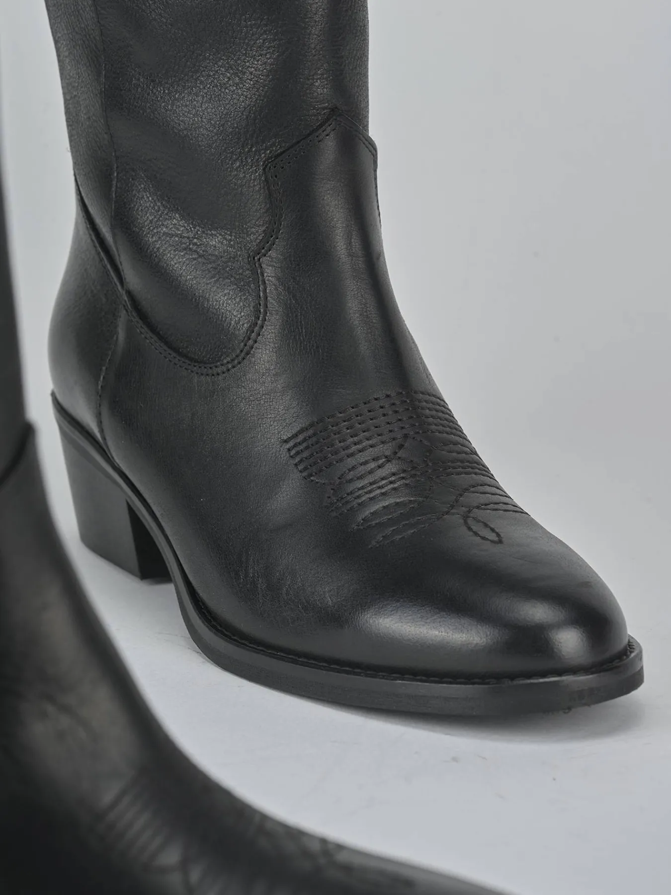 I ricami e le ghette laterali completano il design, mentre l’altezza del gambale, che arriva appena sotto il ginocchio, dona un look slanciato e chic.