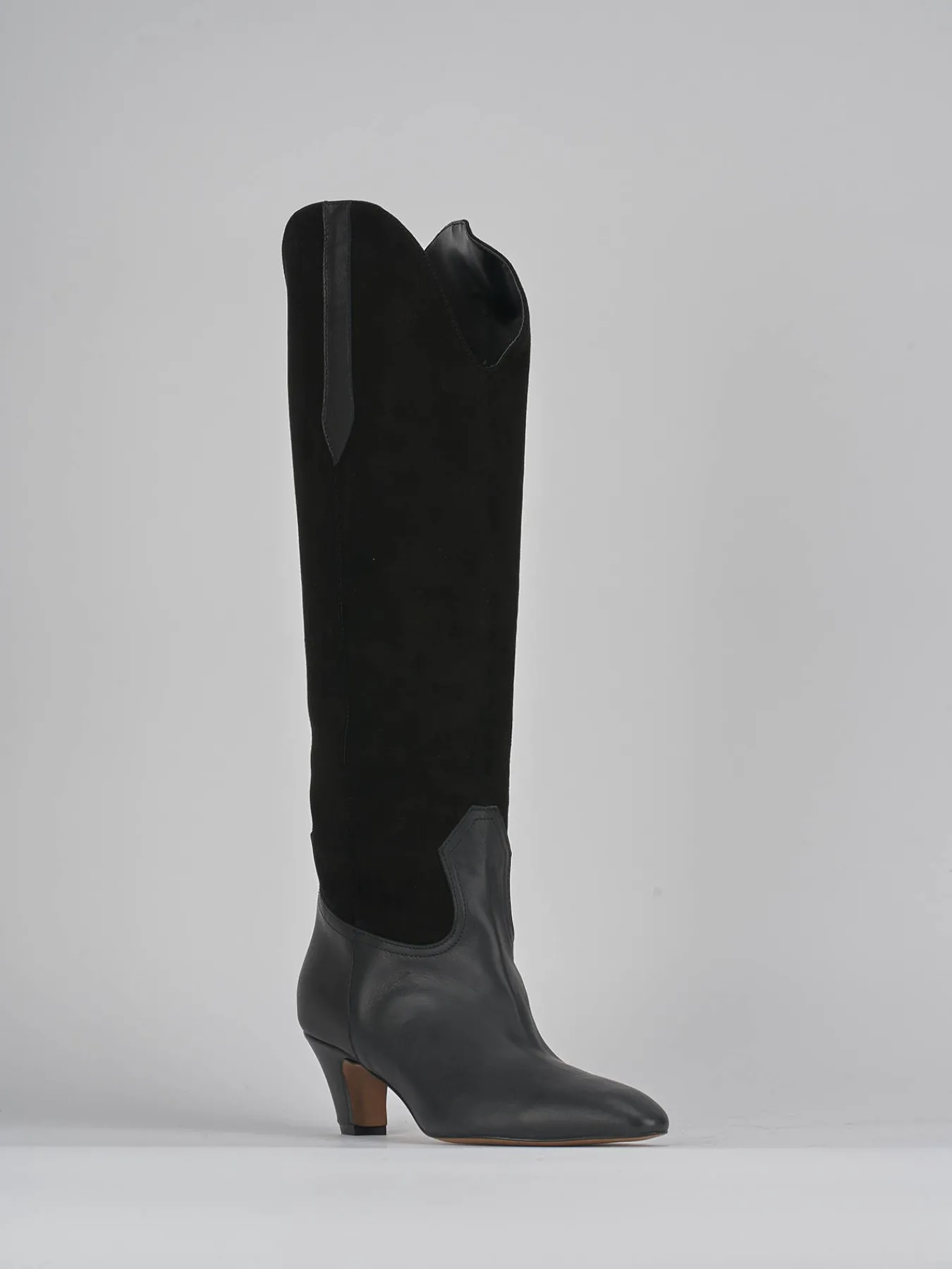 Stivale tacco 5 cm fondo in gomma e soletto interno in vera pelle. Tomaia in morbida pelle, punta sfilata, cuciture visibili, ghette, gambale scamosciato che misura appena sotto il ginocchio con apertura a V per un richiamo allo stile texano.
