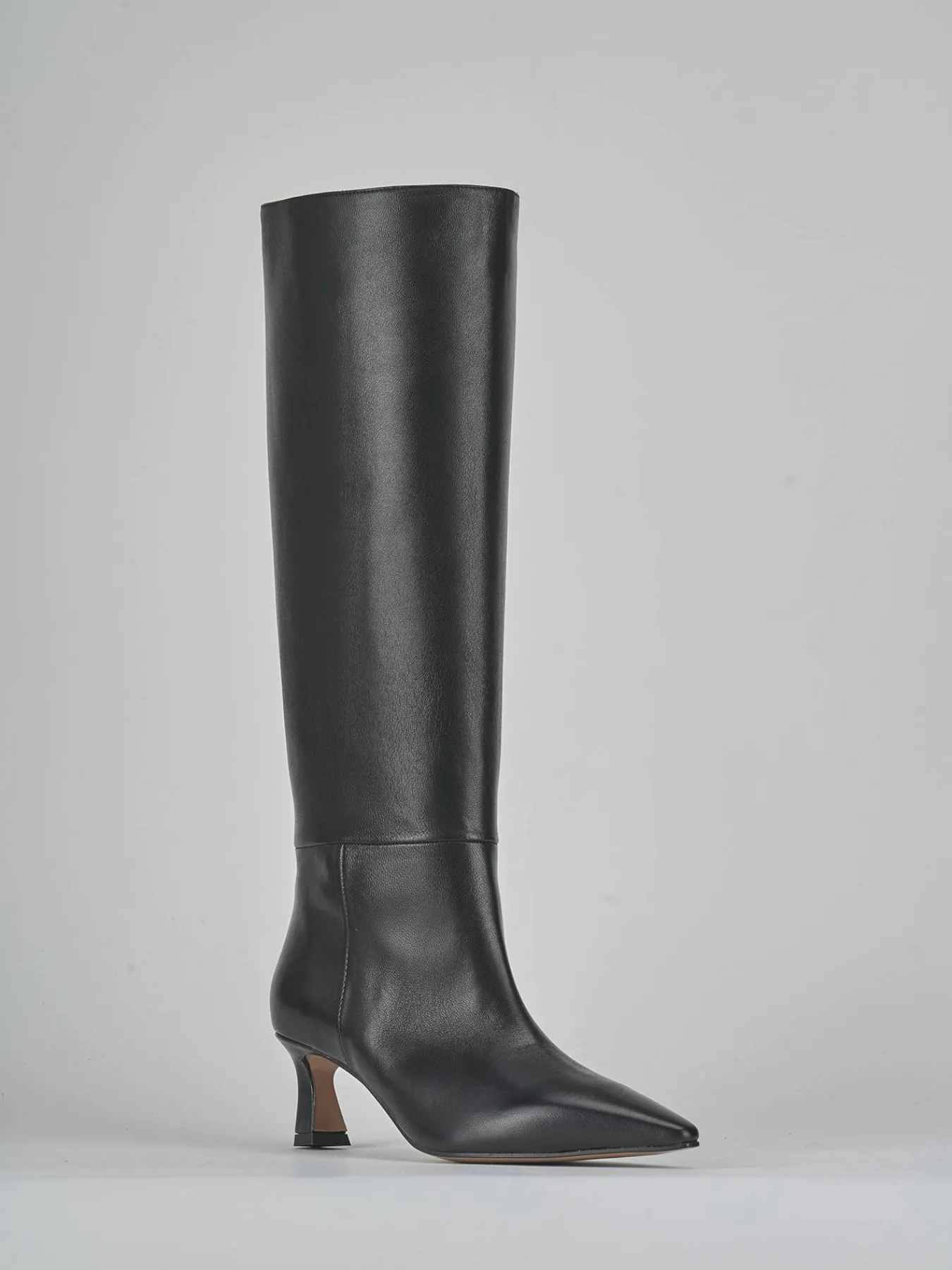 Realizzati in morbida pelle nera nappata, questi stivali presentano un’elegante punta sfilata e cuciture a mano che esaltano il gambale tubolare, che si ferma appena sotto il ginocchio.