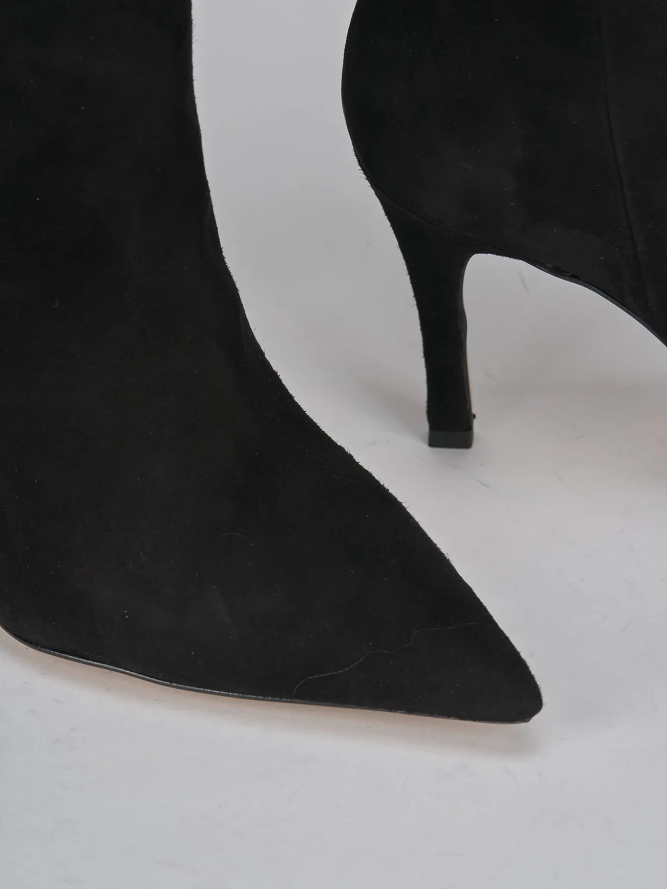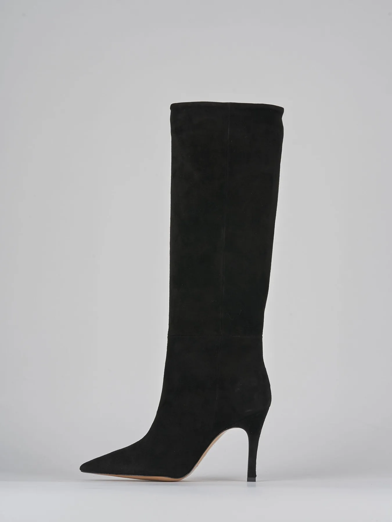 stivale tacco 8.5 cm fondo in leggera gomma e soletto interno in vera pelle. tomaia in morbida pelle scamosciata, punta sfilata, liscio, tacco rocchetto e altezza gambale appena sotto il ginocchio. perfetta versatilità per tutte le tue occasioni e per ogni stagione.