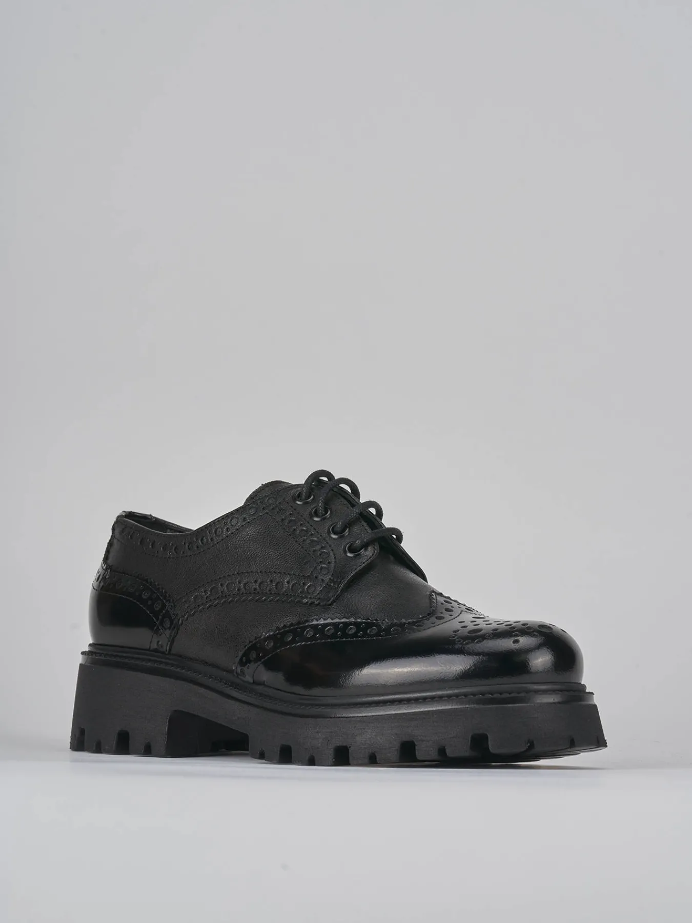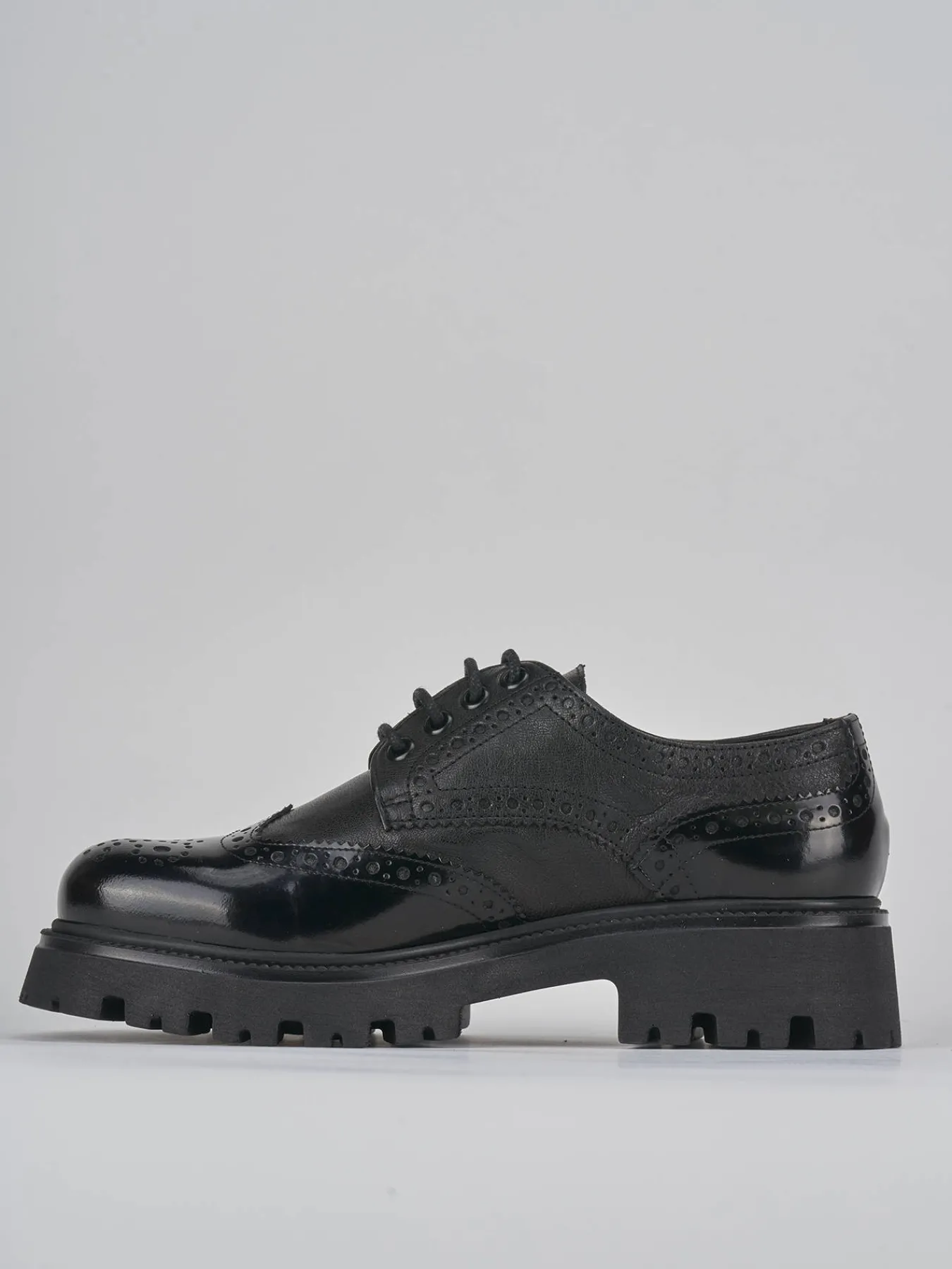 Stringata tacco 2 cm fondo in gomma e soletto interno in vera pelle. Tomaia in pelle di ottima qualità con pregiata lavorazione inglese e combinazione di due pellami differenti, rock raffinato e particolare fondo seghettato extra light per un look chic.
