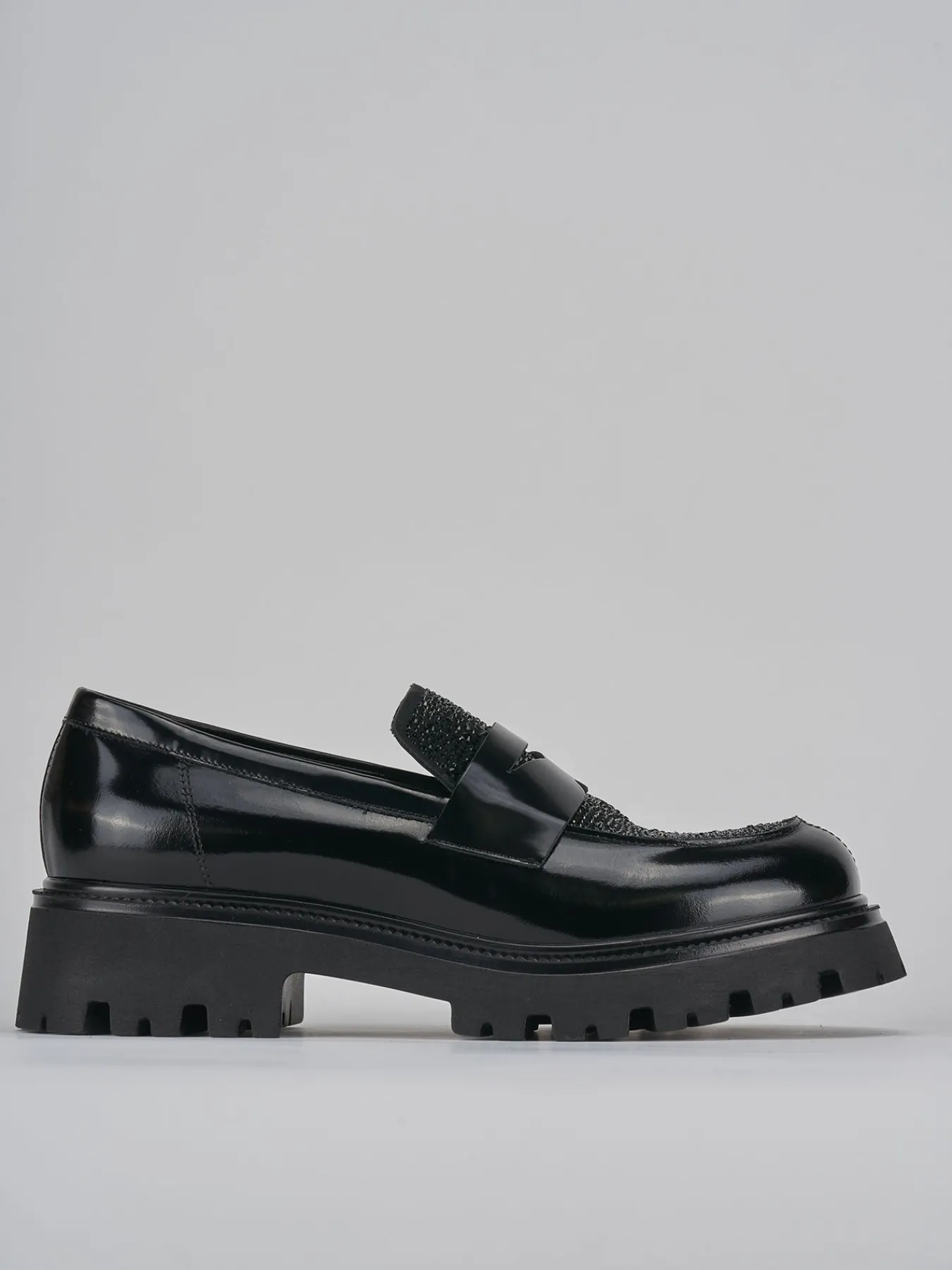 Realizzati con una raffinata tomaia in pelle abrasivata effetto lucido, questi mocassini catturano l’attenzione con la loro punta leggermente squadrata arricchita da strass scintillanti.