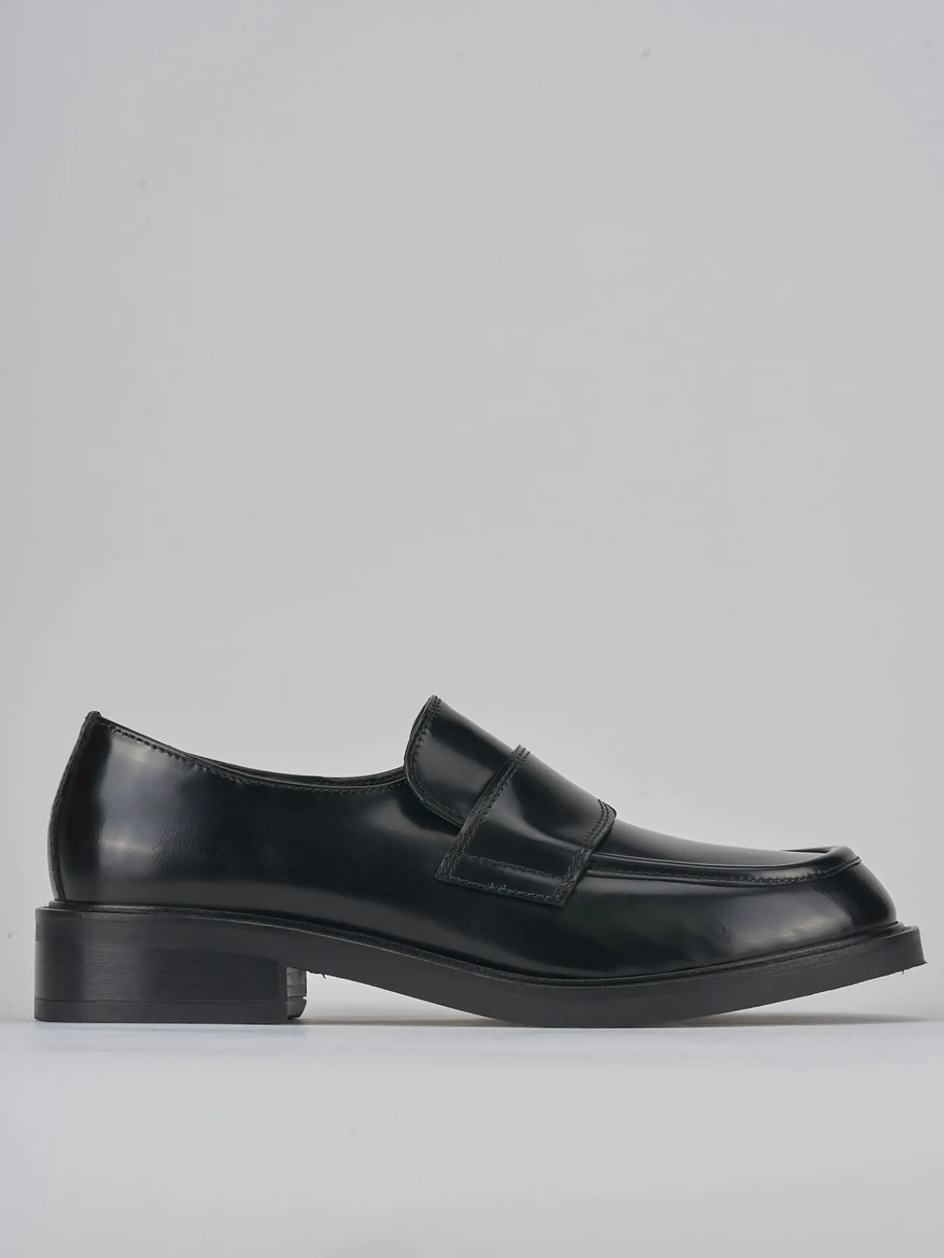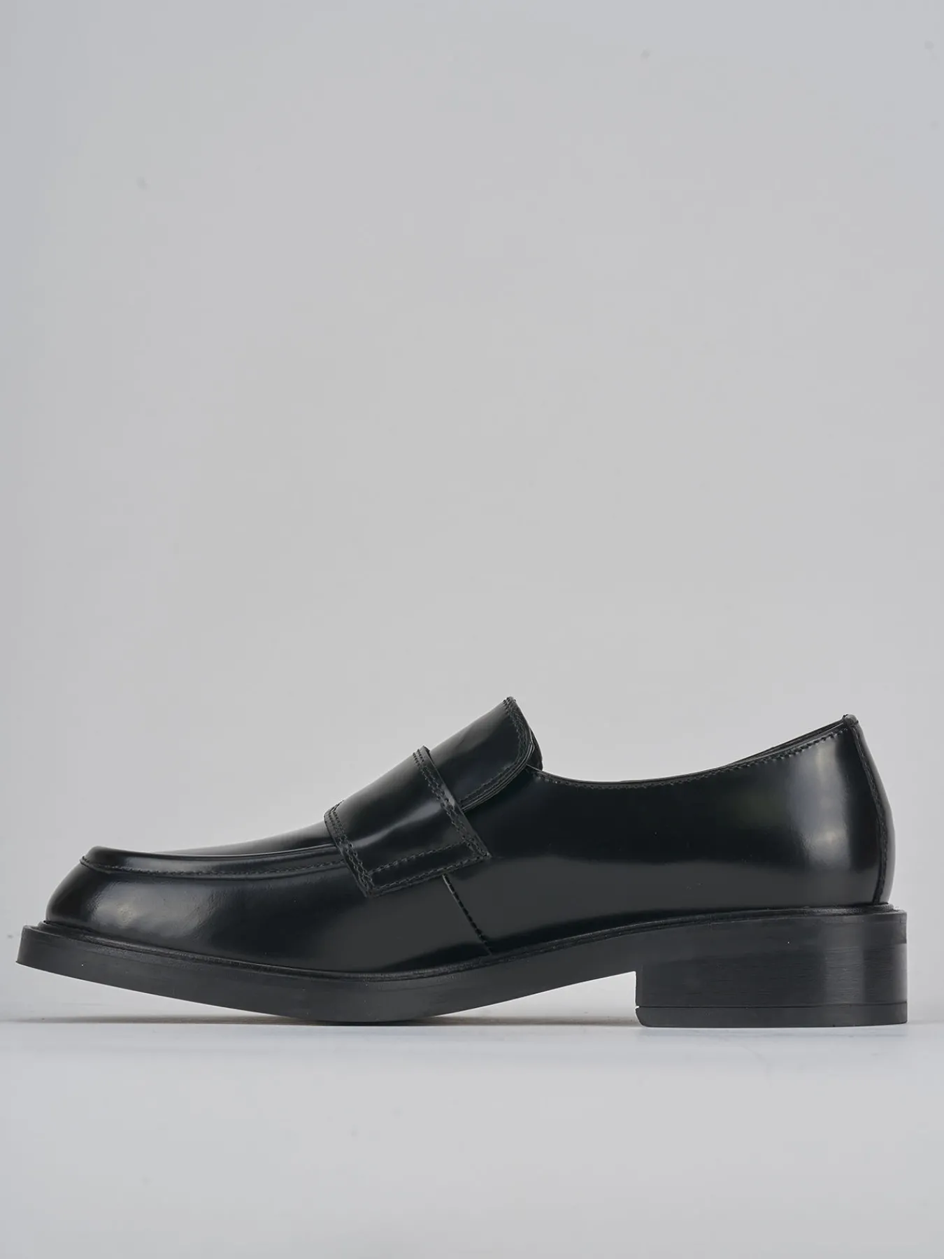 Mocassino tacco 2 cm fondo in gomma e soletto interno in vera pelle. Tomaia in morbida pelle spazzolata, punta leggermente squadrata, cuciture visibili e fascia orizzontale sul collo del piede per un look di classe che dura nelle stagioni.