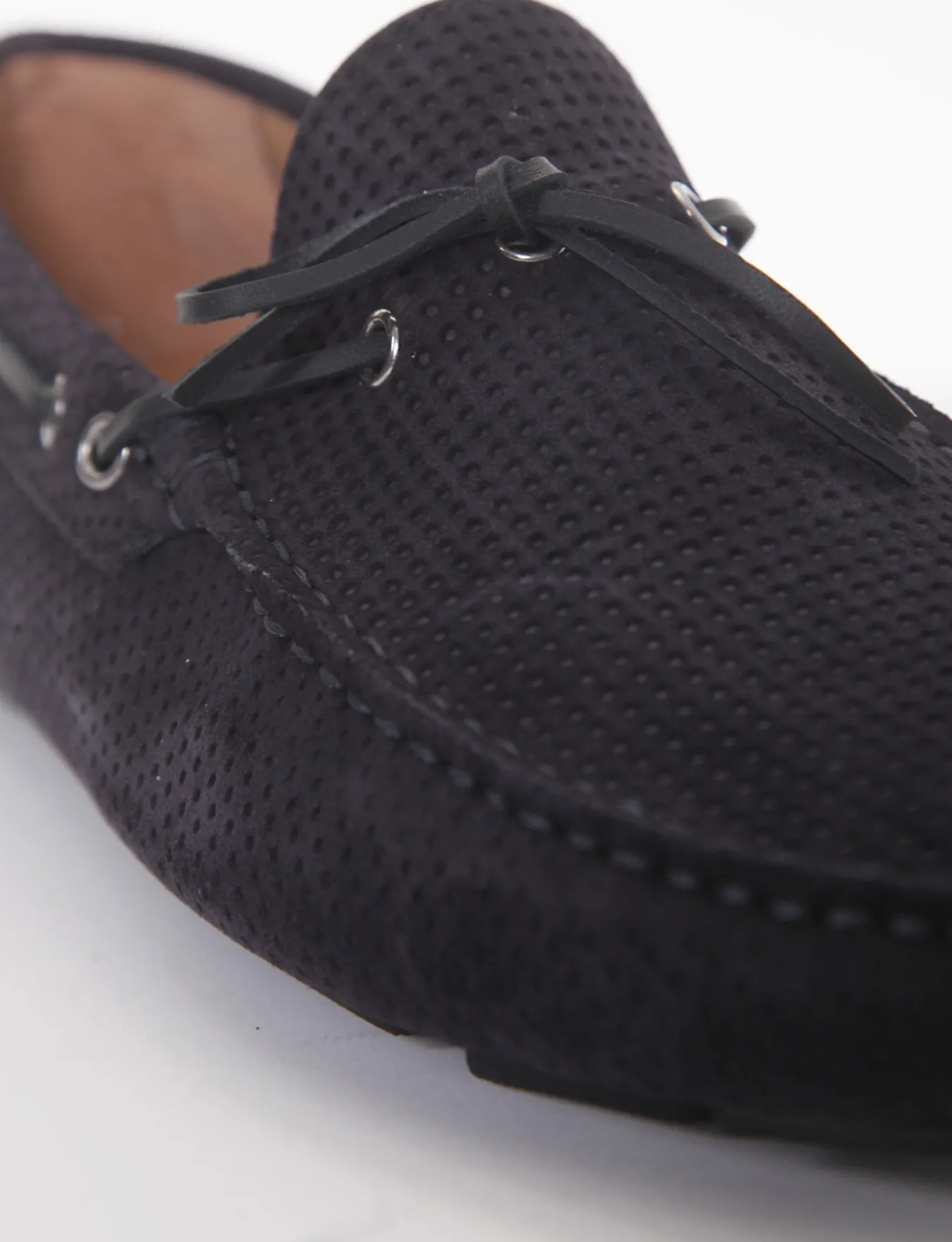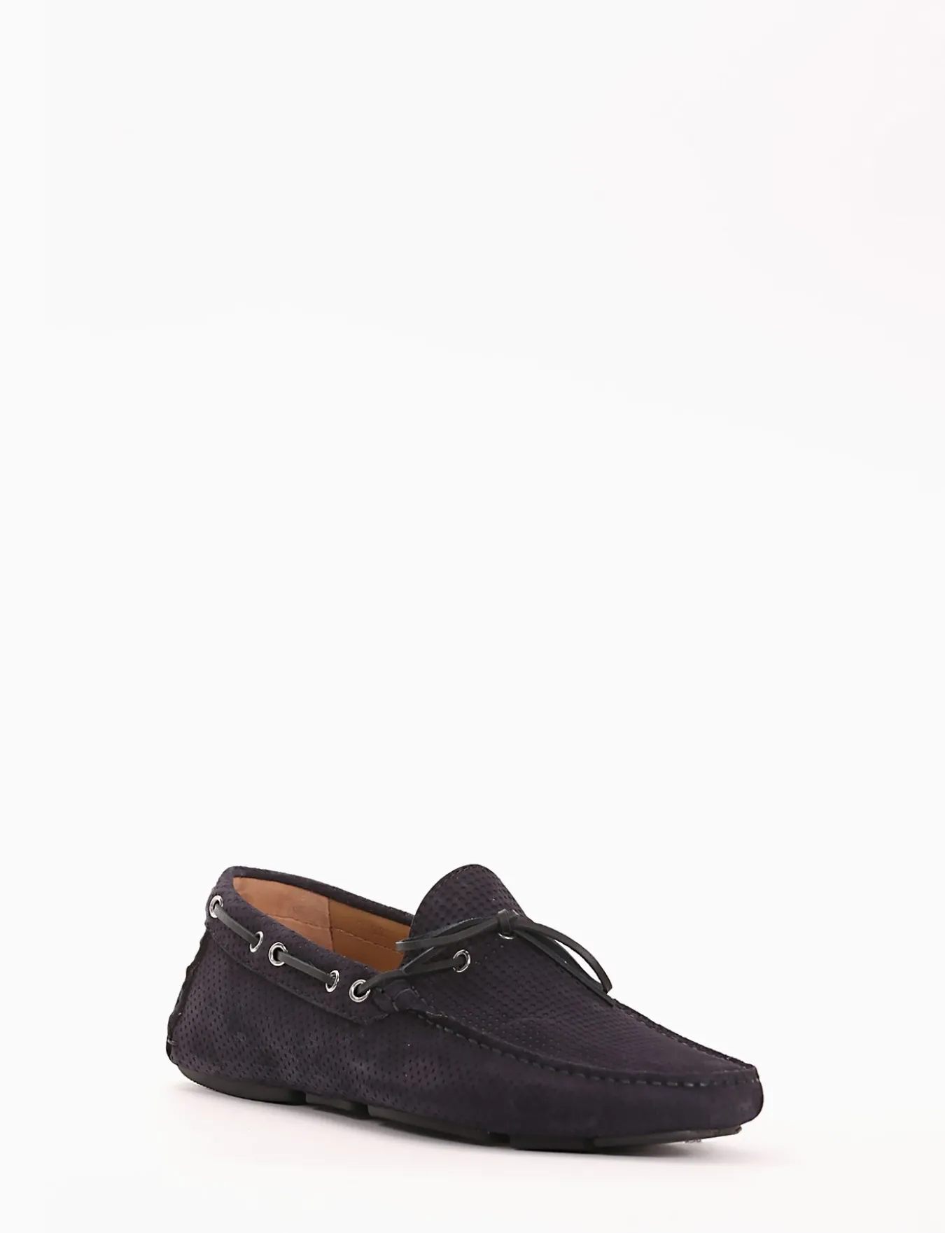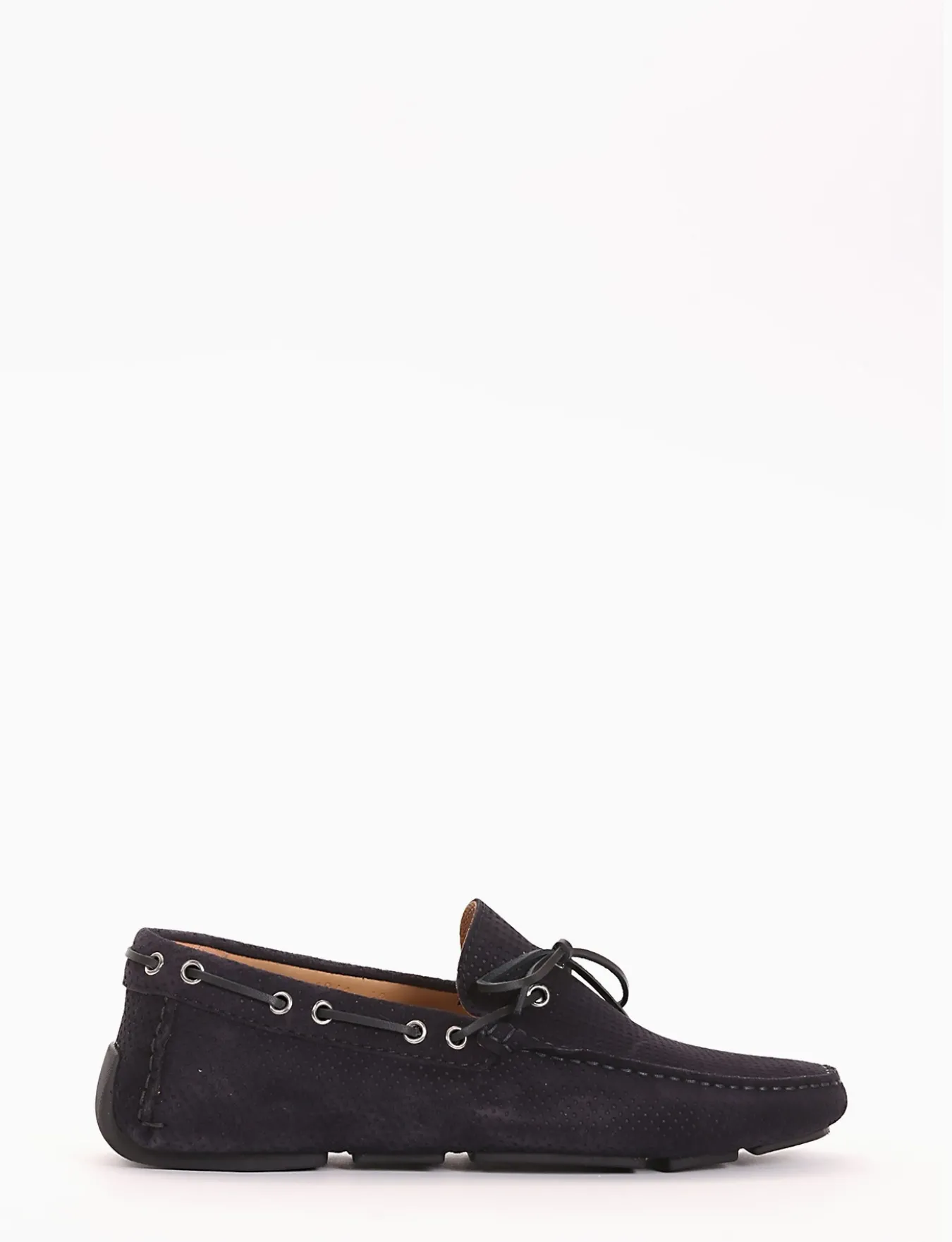 mocassino fondo gomma e soletto interno in vera pelle. Tomaia in morbidissimo camoscio con traforatura a piccoli quadrati , laccetto in pelle sul collo del piede.