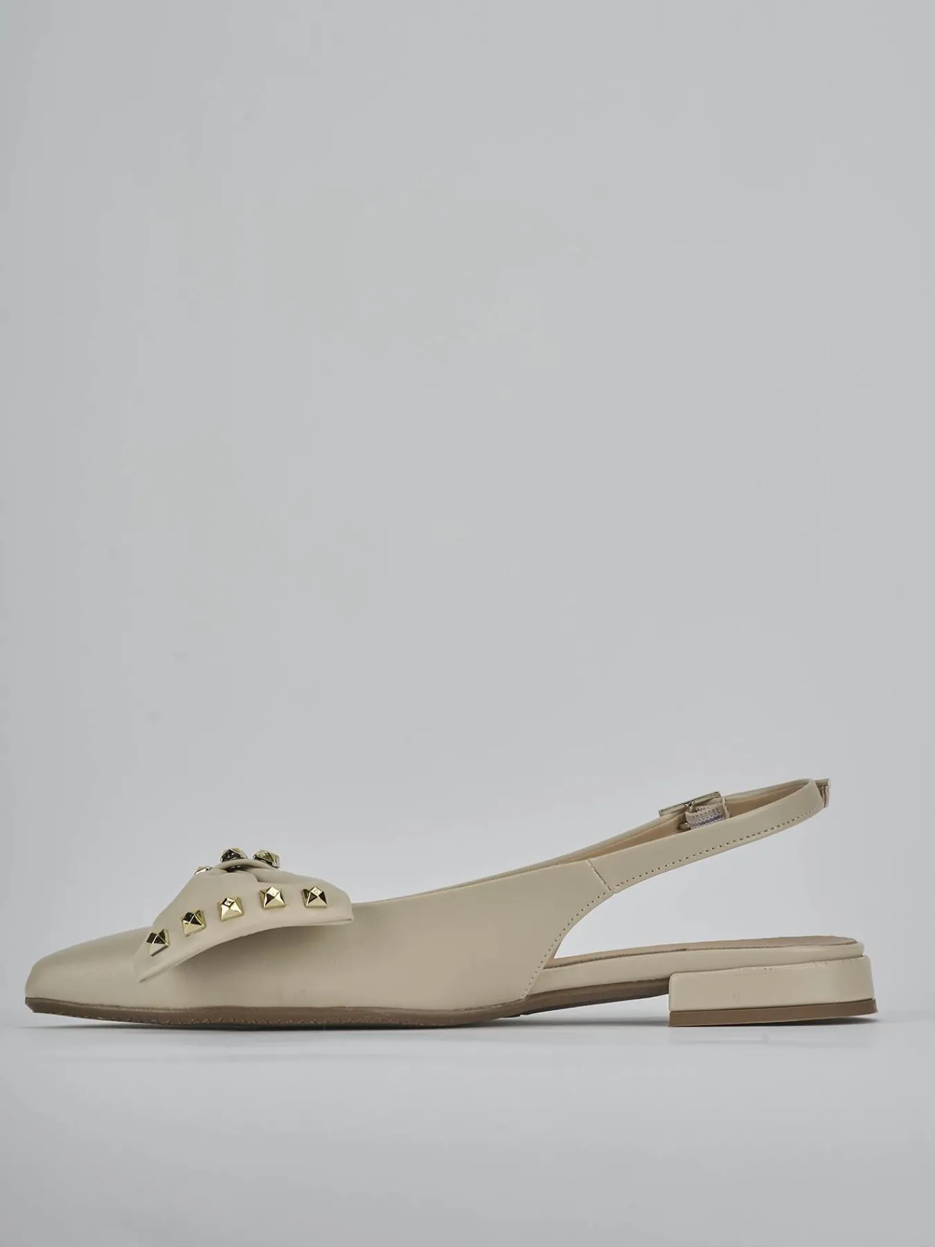 Ballerina tacco 2 cm fondo in leggerissima gomma e soletto interno in vera pelle. Tomaia in morbida pelle, punta sfilata, scollo morbido a ‘U’, fiocco, borchie, cinturino con fibbia regolabile e tacco stabile. Perfetto per un tocco cool ai tuoi look.