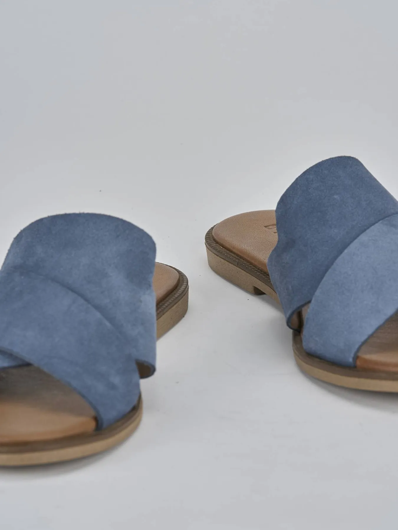 La tomaia in morbido camoscio avvolge il piede con eleganza, mentre le fasce incrociate e la piccola mascherina conferiscono un tocco distintivo.