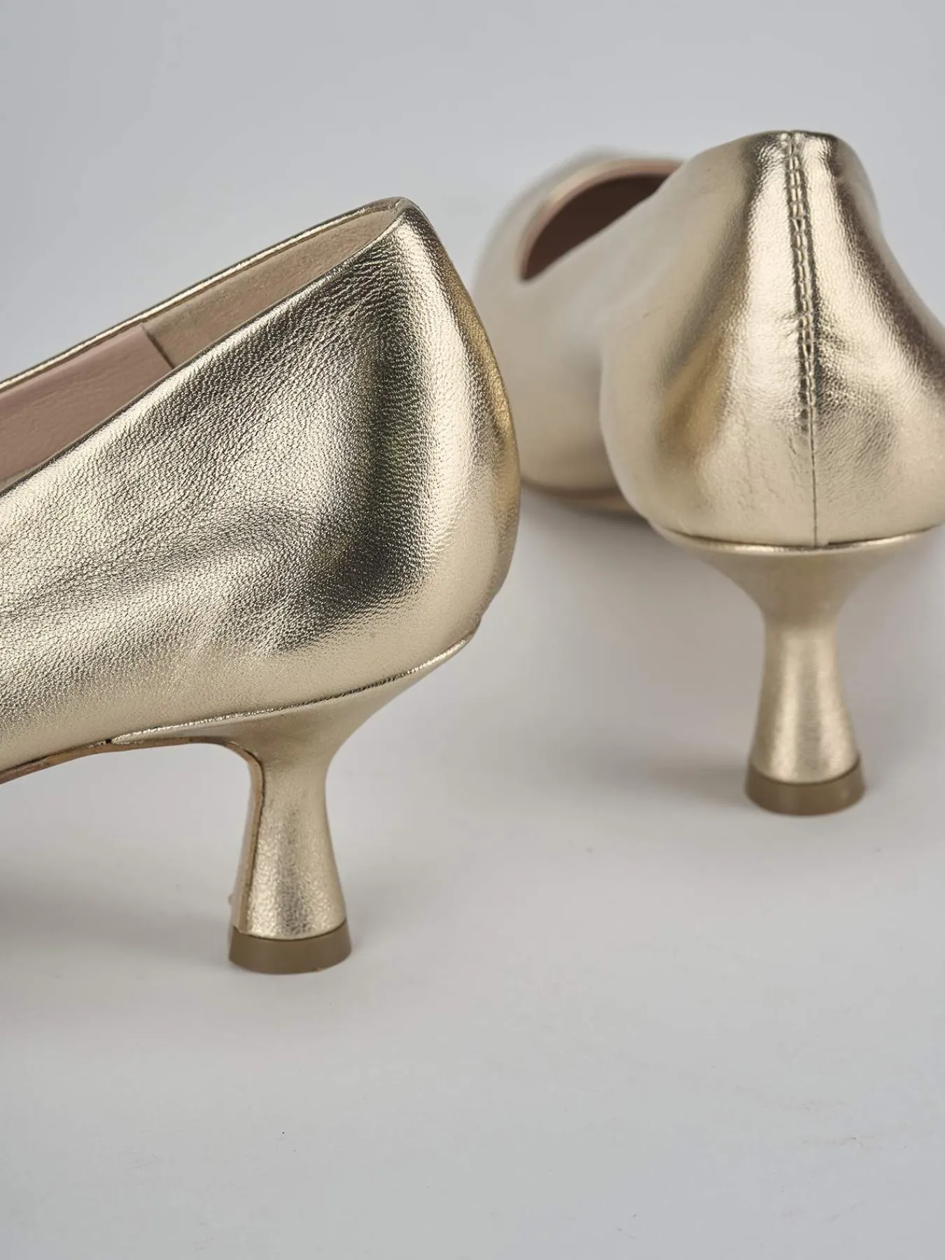 Decolte’ tacco 5 cm fondo in cuoio e soletto interno in vera pelle. Tomaia in morbida pelle laminata, punta sfilata, cuciture a mano, scollo profondo squadrato e particolare tacco rocchetto. Dalle linee semplici e definite, è il modello che dura nel tempo.
