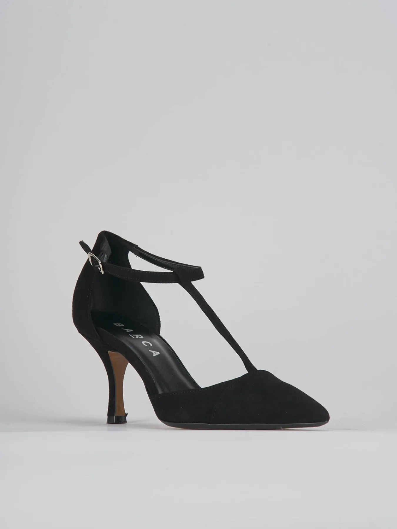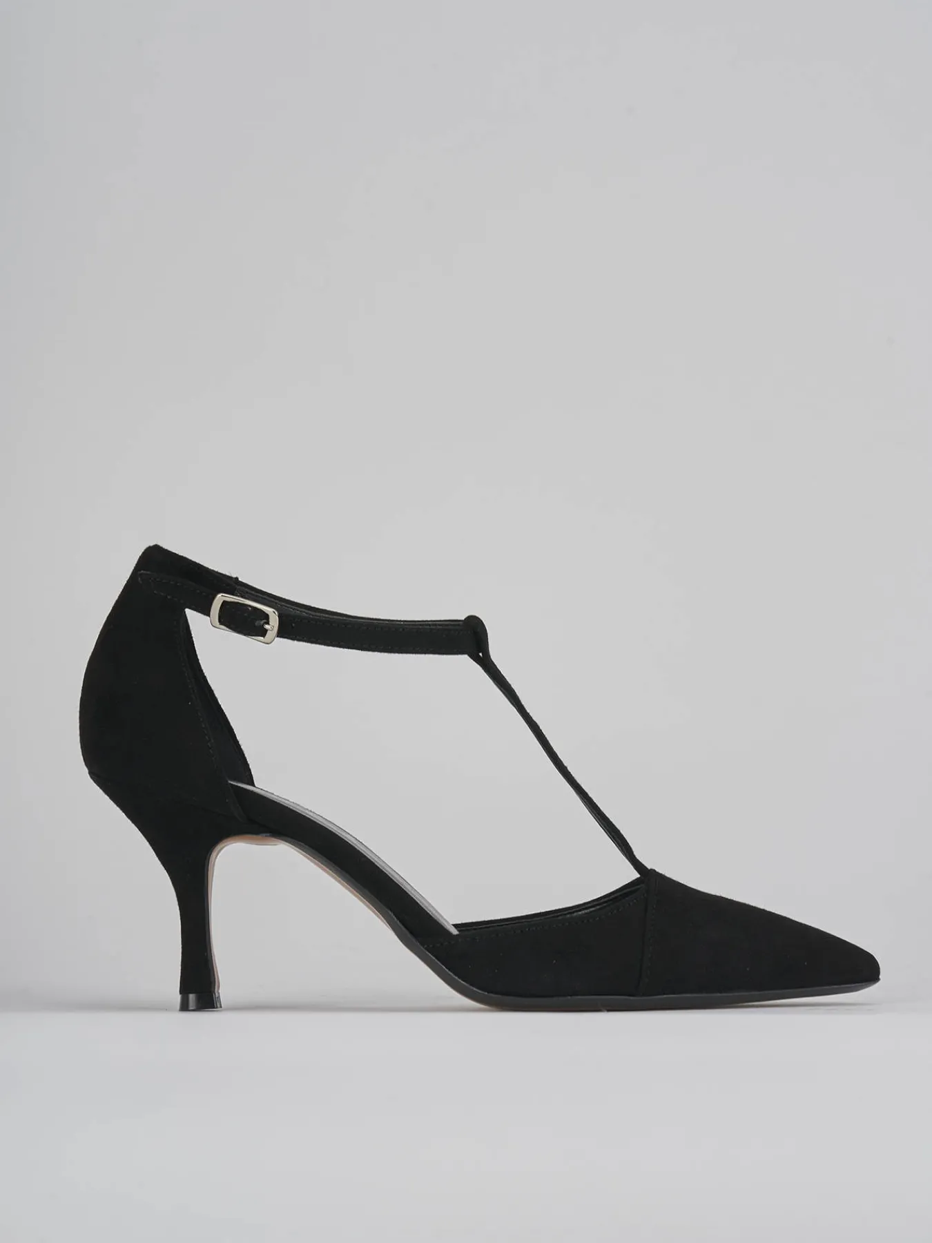 Bebè tacco 7 cm fondo in gomma e soletto interno in vera pelle. Tomaia in morbido camoscio, punta sfilata, cinturino a ‘T’ con fibbia regolabile intorno alla caviglia e tallone chiuso per un look cool.