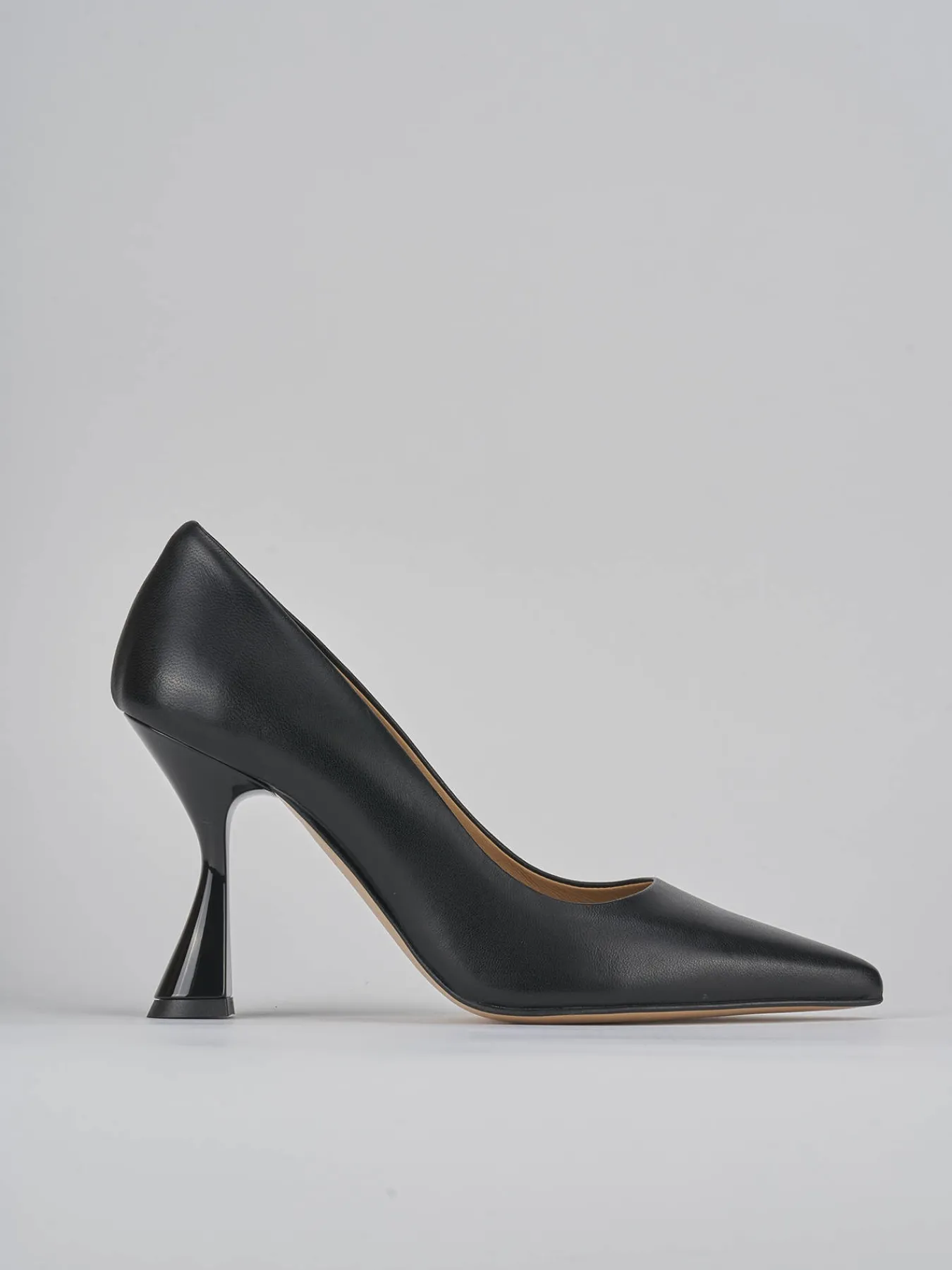 Decoltè tacco 9 cm fondo in cuoio e soletto interno in vera pelle. Tomaia in morbida pelle nappata, punta sfilata, apertura svasata e tacco rocchetto in materiale abs per un look estremamente versatile.