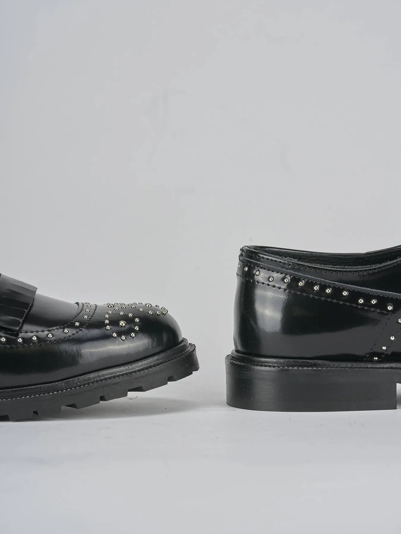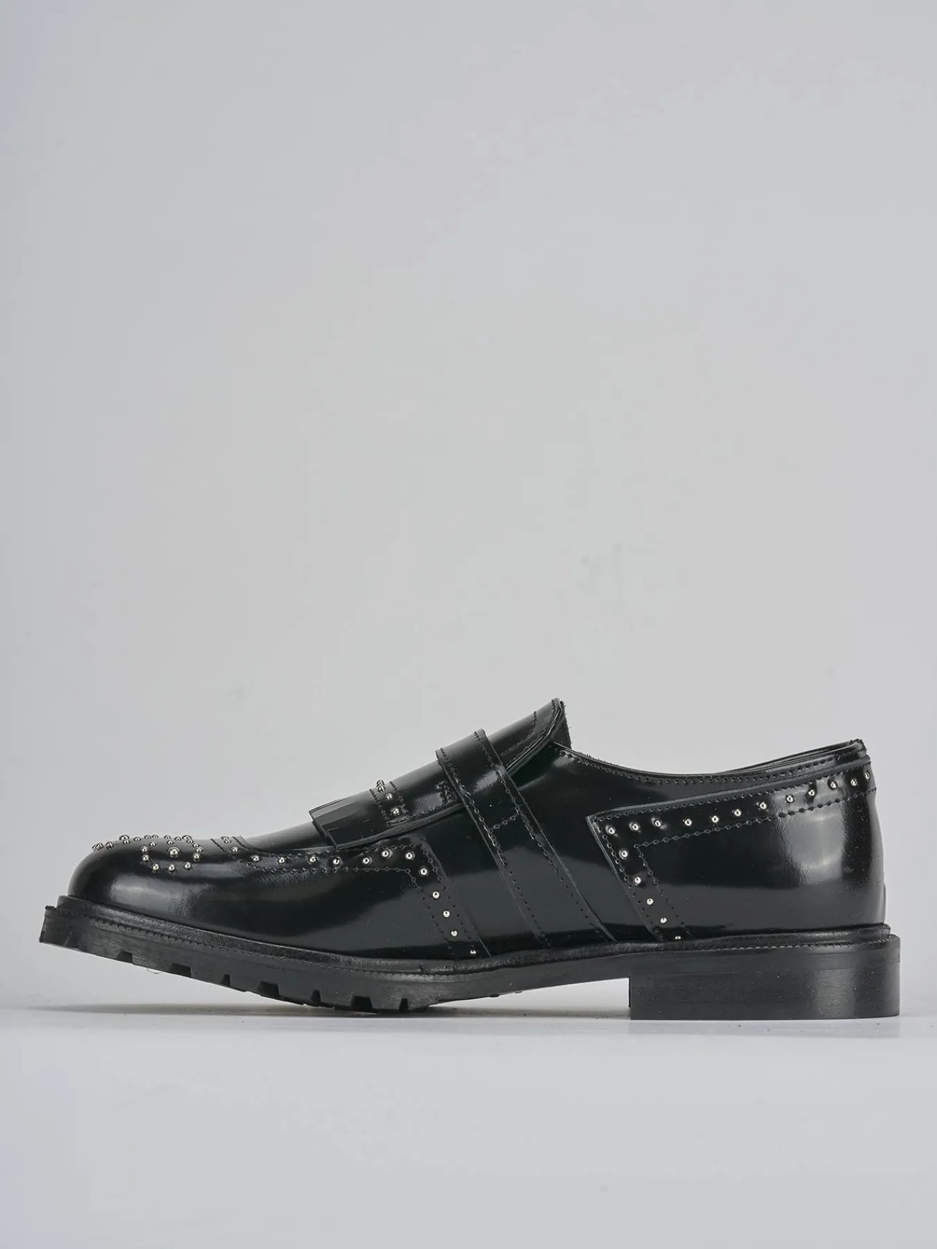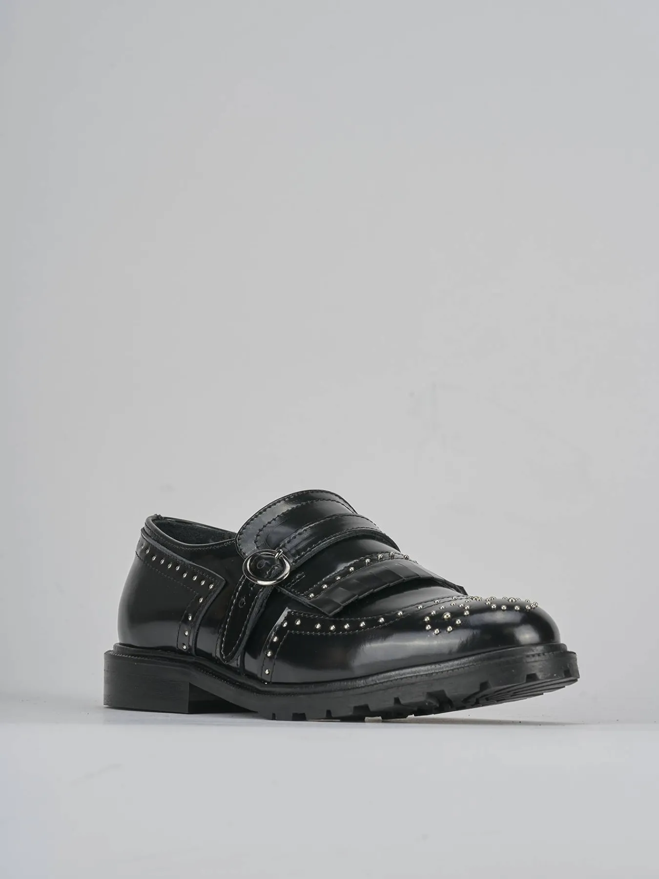 La punta affusolata e le cuciture visibili aggiungono un tocco di classe, mentre la fibbia e le frange sul collo del piede donano un dettaglio distintivo.