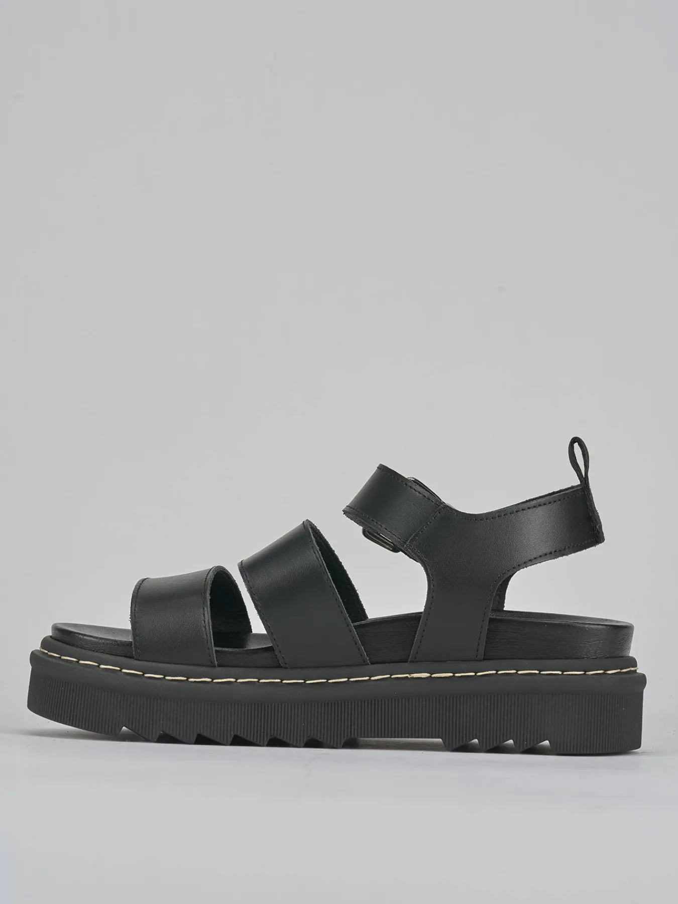 Sandalo fondo over 2 cm in leggerissima gomma e soletto interno in vera pelle. Tomaia in morbida pelle, punta tonda, fasce e cinturino con fibbia regolabile per un look street-cool.