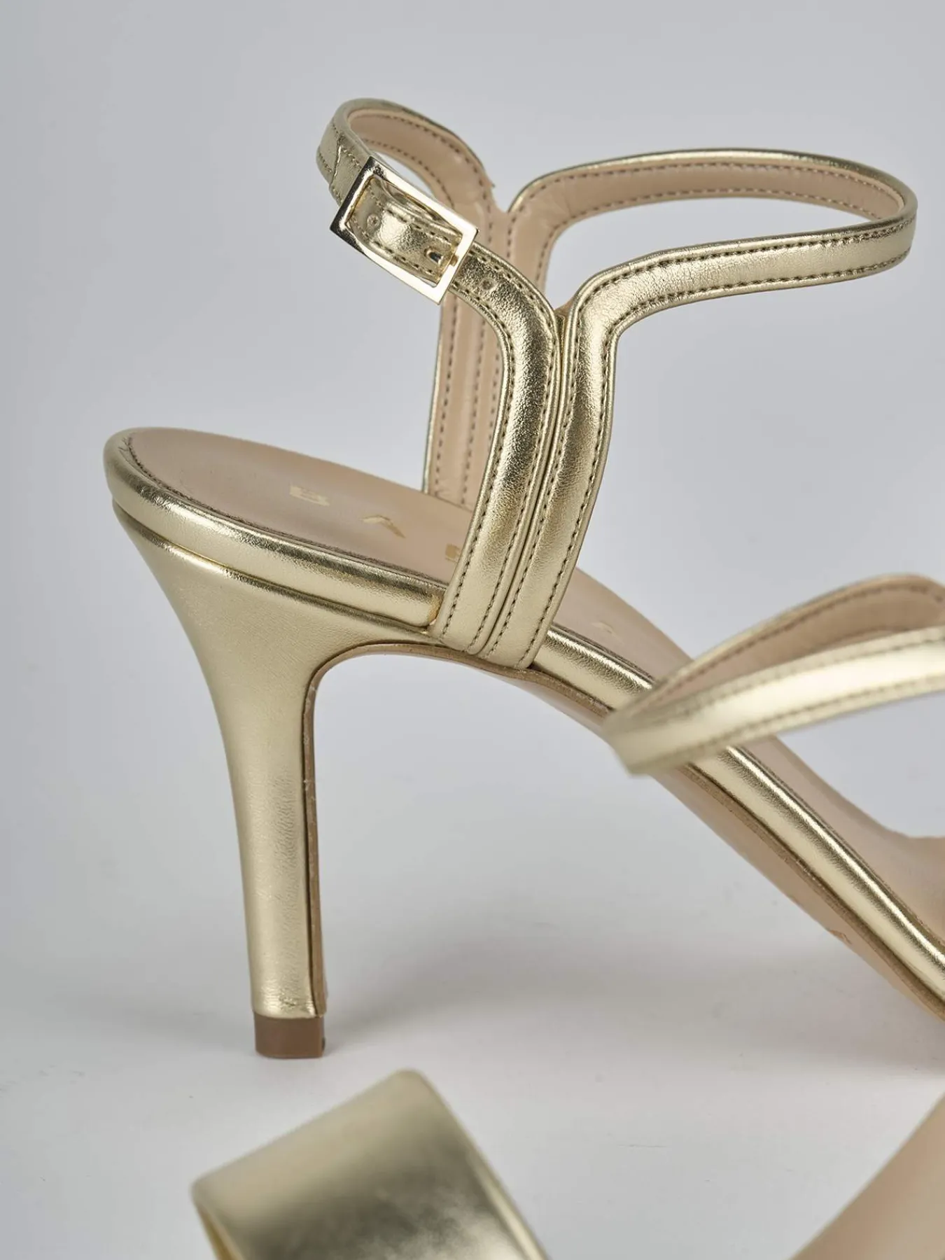 Sandalo tacco 7 cm fondo in leggerissima gomma e soletto interno in vera pelle. Tomaia in morbida pelle laminata, punta affusolata, fascia unica, cinturino con fibbia regolabile e tacco fino. Dal design ricercato che dura nel tempo.