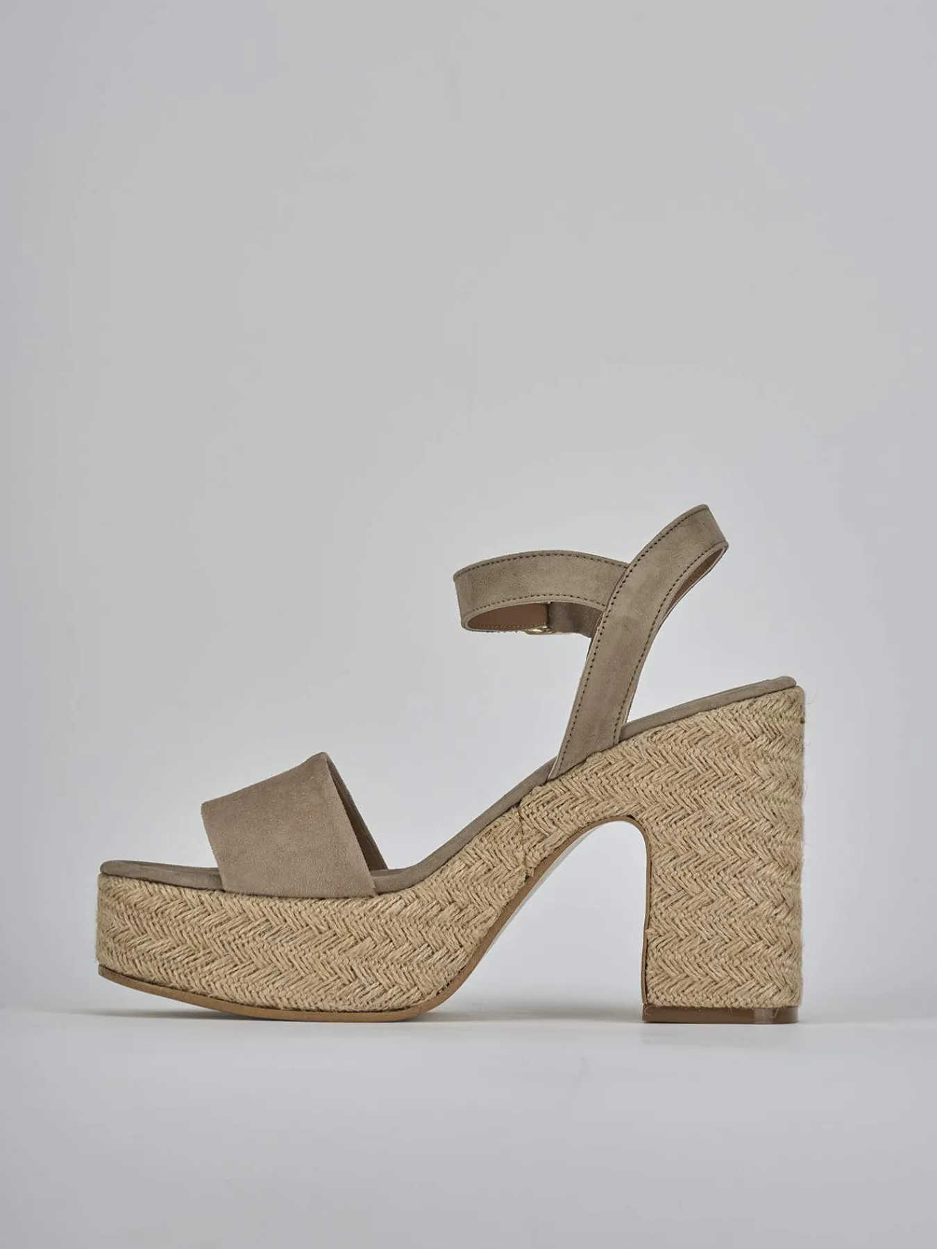 Sandalo tacco 9 cm fondo in leggerissima gomma e soletto interno in vera pelle. Tomaia in morbida pelle scamosciata, punta affusolata, fascia unica, chiusura con cinturino con fibbia regolabile in caviglia e comodo tacco grosso per una maggior stabilità e comfort. Plato’ alto 3cm nella parte anteriore in rafia.