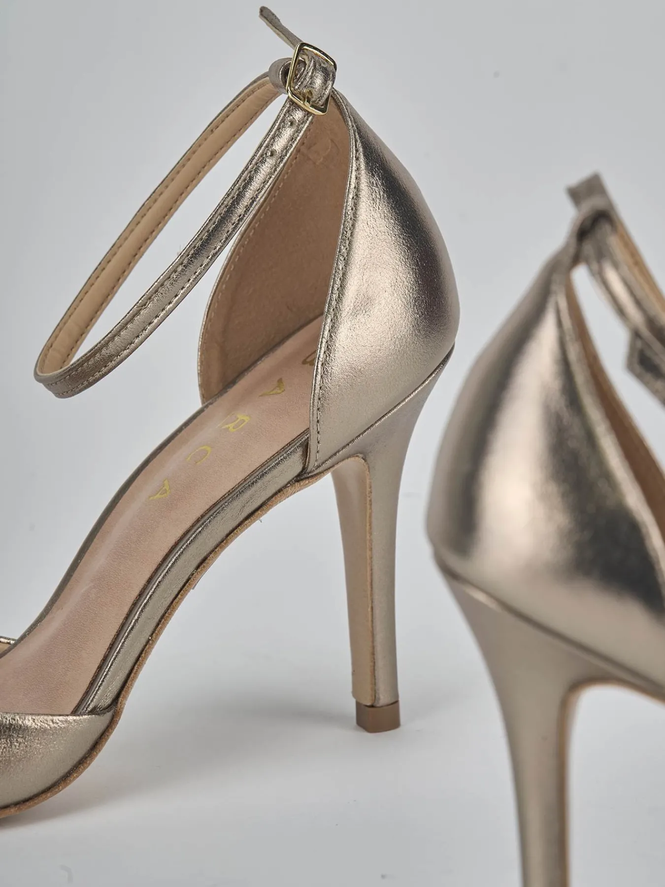 Sandalo tacco 9 cm fondo in leggerissima gomma e soletto interno in vera pelle. Tomaia in morbida pelle laminata, punta affusolata, fascia unica, cinturino in caviglia con fibbia regolabile e tacco fino per un look cool.