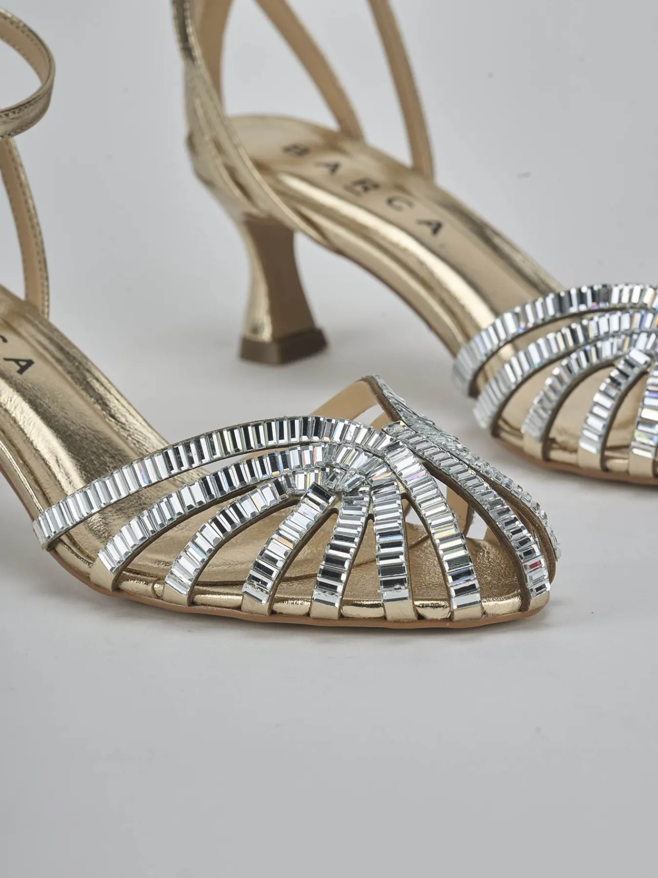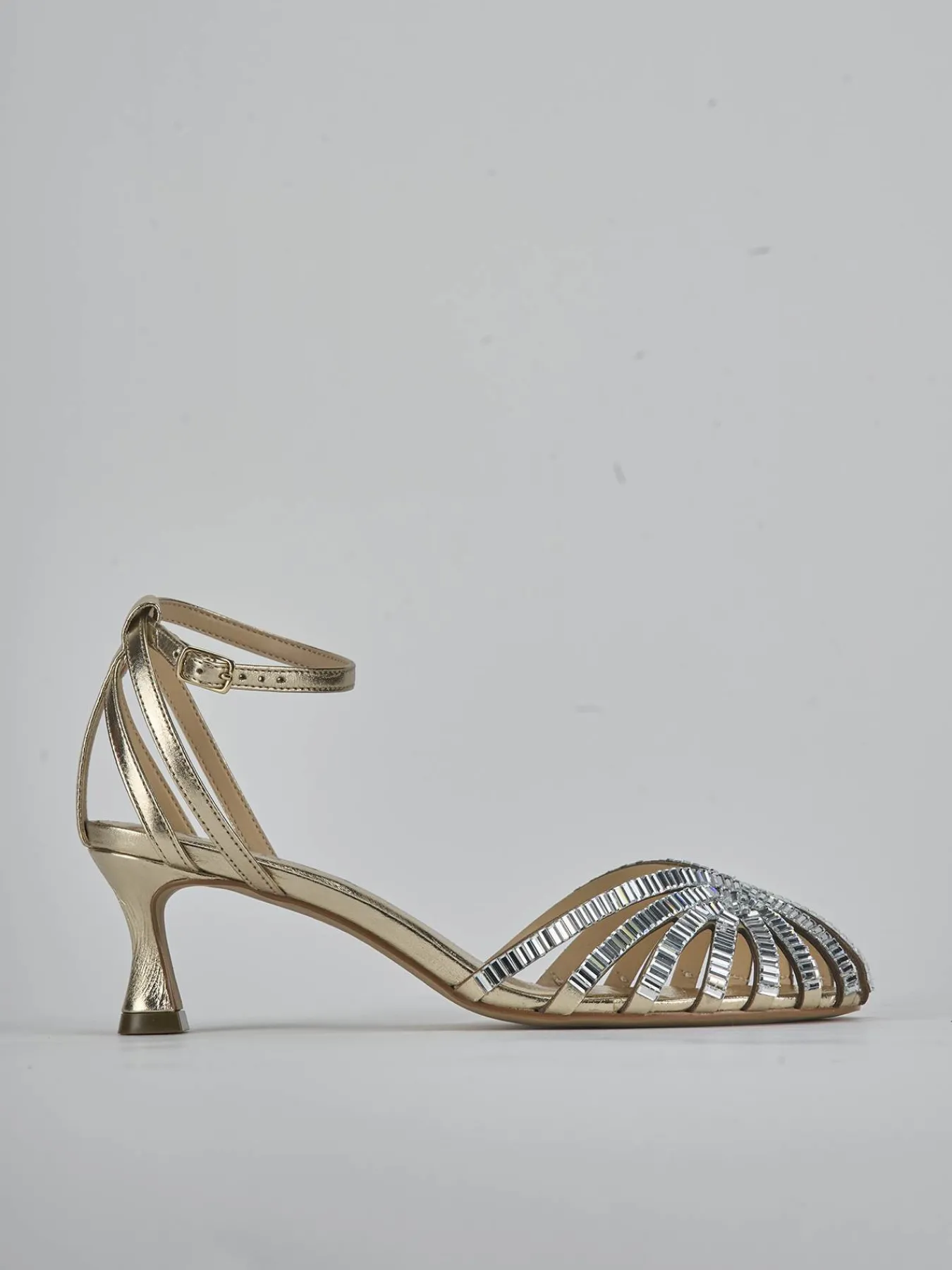 Sandalo tacco 9 cm fondo in leggerissima gomma e soletto interno in vera pelle. Tomaia in morbida pelle effetto laminato con ragnetto chiuso foderato da lucenti strass rettangolari. Cinghietta in caviglia e tallone libero per un look super chic ideale anche per le cerimonie piu’ importaanti.