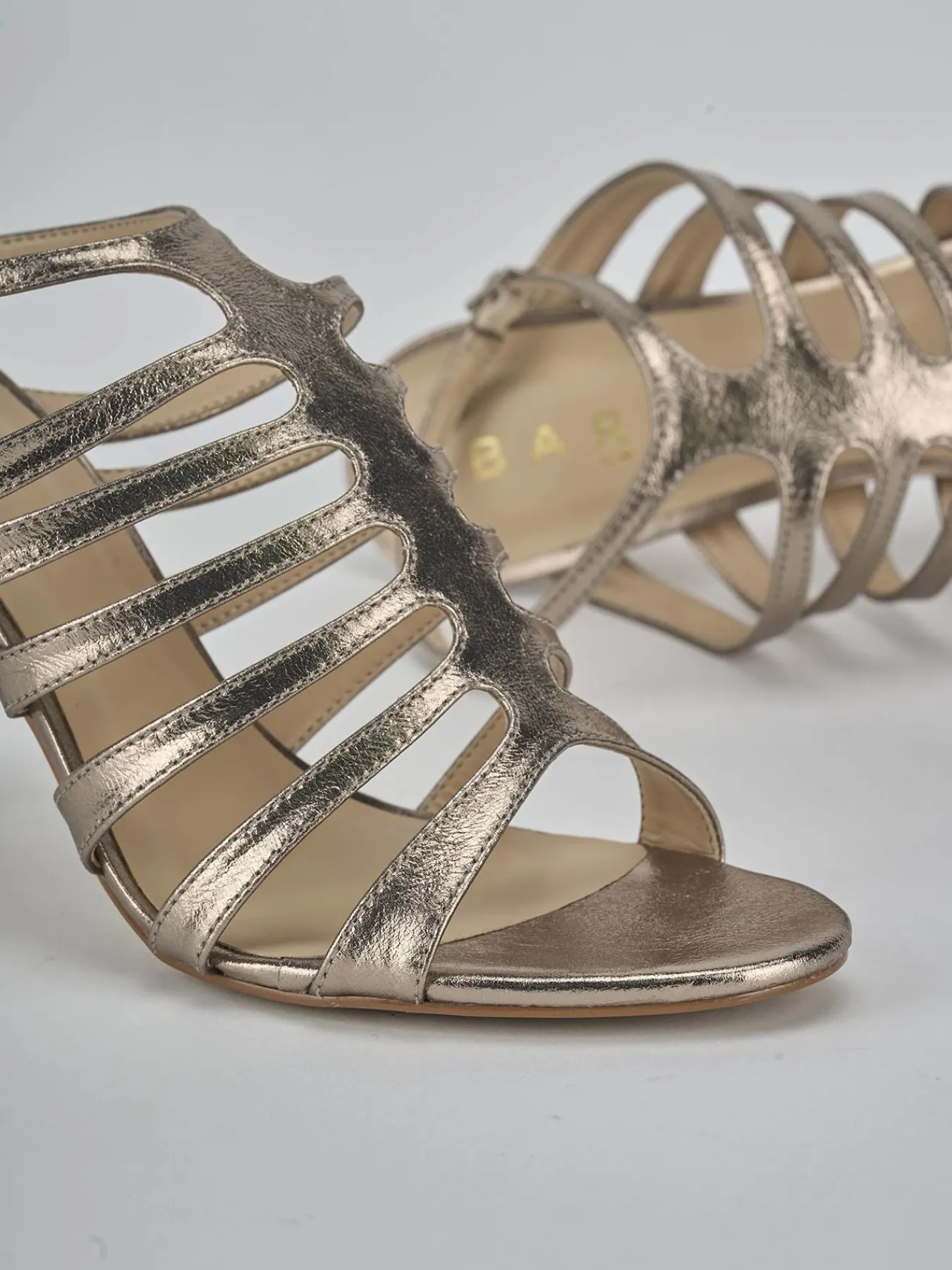 Sandalo tacco 9 cm fondo in leggerissima gomma e soletto interno in vera pelle. Tomaia in morbida pelle effetto laminato nuances platino, punta affusolata, mini fasce unite dal cinturino ‘T’ che arriva fino alla cavigliera con fibbia regolabile per un look cool.Ideale per tutti i tuoi eventi e cerimonie piu’ importanti.