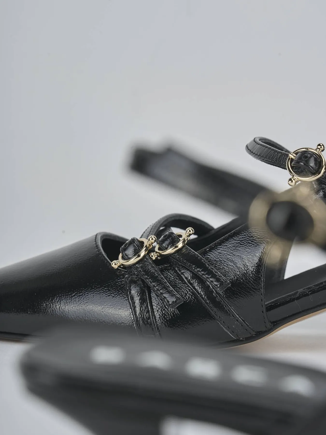 Slingback decolte’ tacco 3 cm fondo in leggerissima gomma e soletto interno in vera pelle. Tomaia in morbida pelle effetto verniciato, punta sfilata, collo squadrato, cinturini con fibbia regolabile incrociati sulla punta e cinturino in caviglia e nuovissimo tacco rocchetto per un look chic.