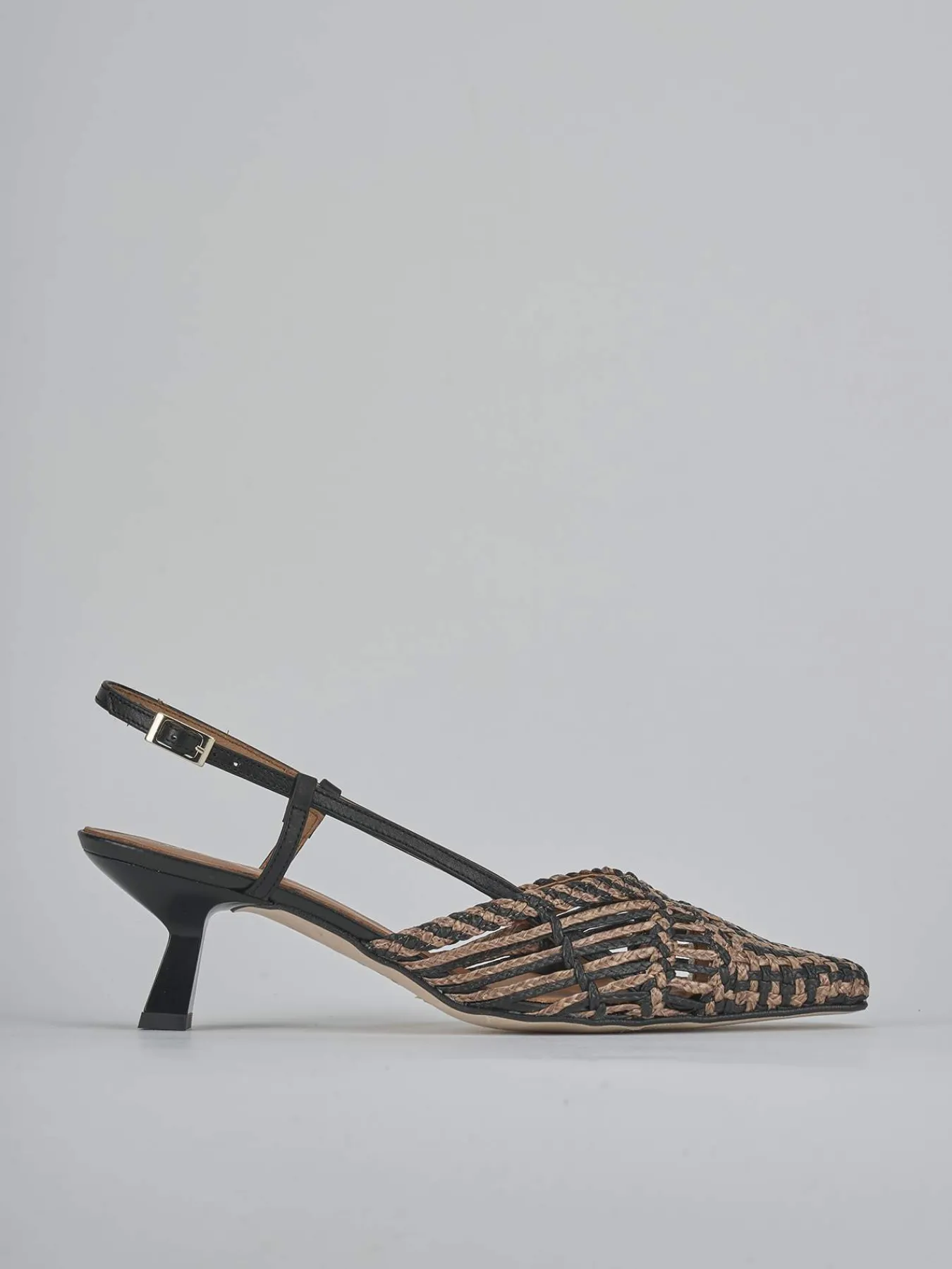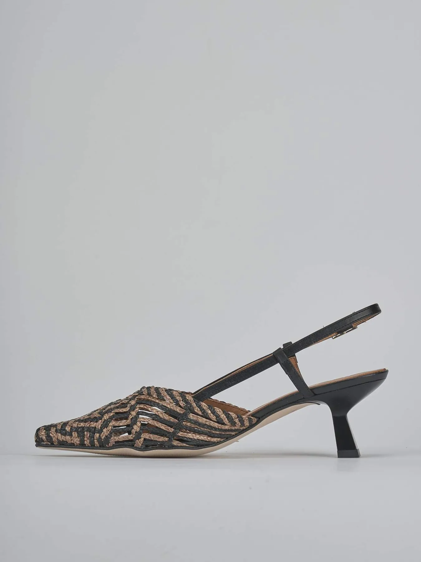 Slingback decolte’ tacco 5 cm fondo in leggerissima gomma e soletto interno in vera pelle. Tomaia in morbida pelle e rafia intrecciata a mano, punta sfilata, bicolor, scollo a ‘V’, cinturino con fibbia regolabile e tacco rocchetto per un look cool.