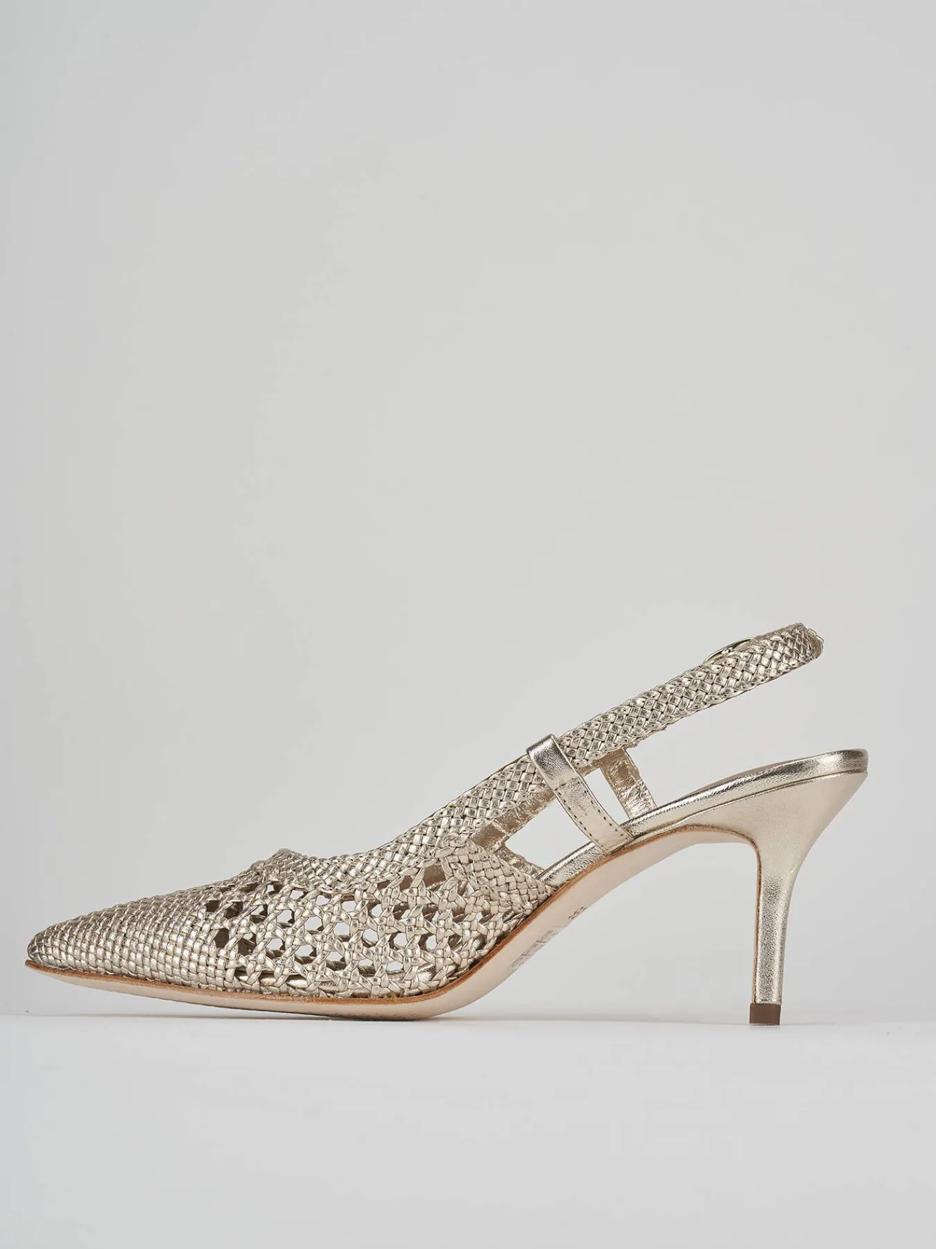 Slingback decolte tacco 7 cm fondo cuoio e soletto interno in vera pelle. tomaia in morbida pelle intrecciata artigianalmente, punta sfilata e chiusura con fibbia per un look cool-chic.
