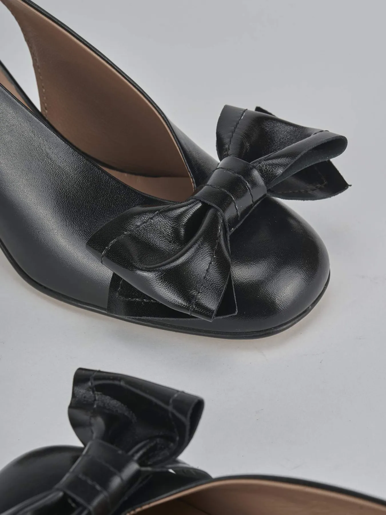 Slingback decolte’ tacco 8 cm fondo in leggerissima gomma e soletto interno in vera pelle. Tomaia in morbida pelle, punta affusolata, scollo a ‘U’, fiocco, cinturino elasticizzato morbido e tacco cilindrico. Dal design curato, che ti farà notare.