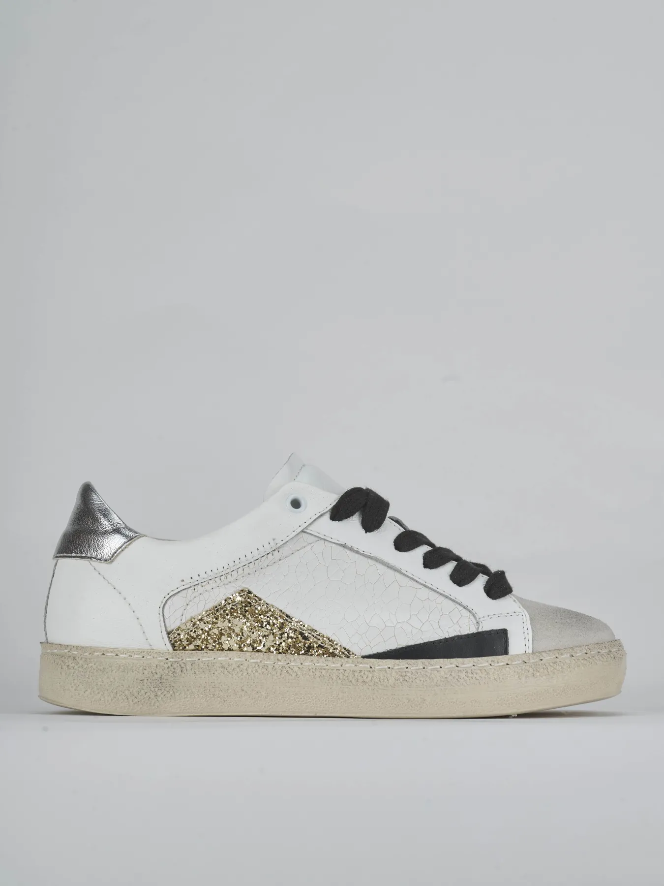 Il topponcino a contrasto e i lati con riporto in glitter platino donano un look chic e sofisticato.