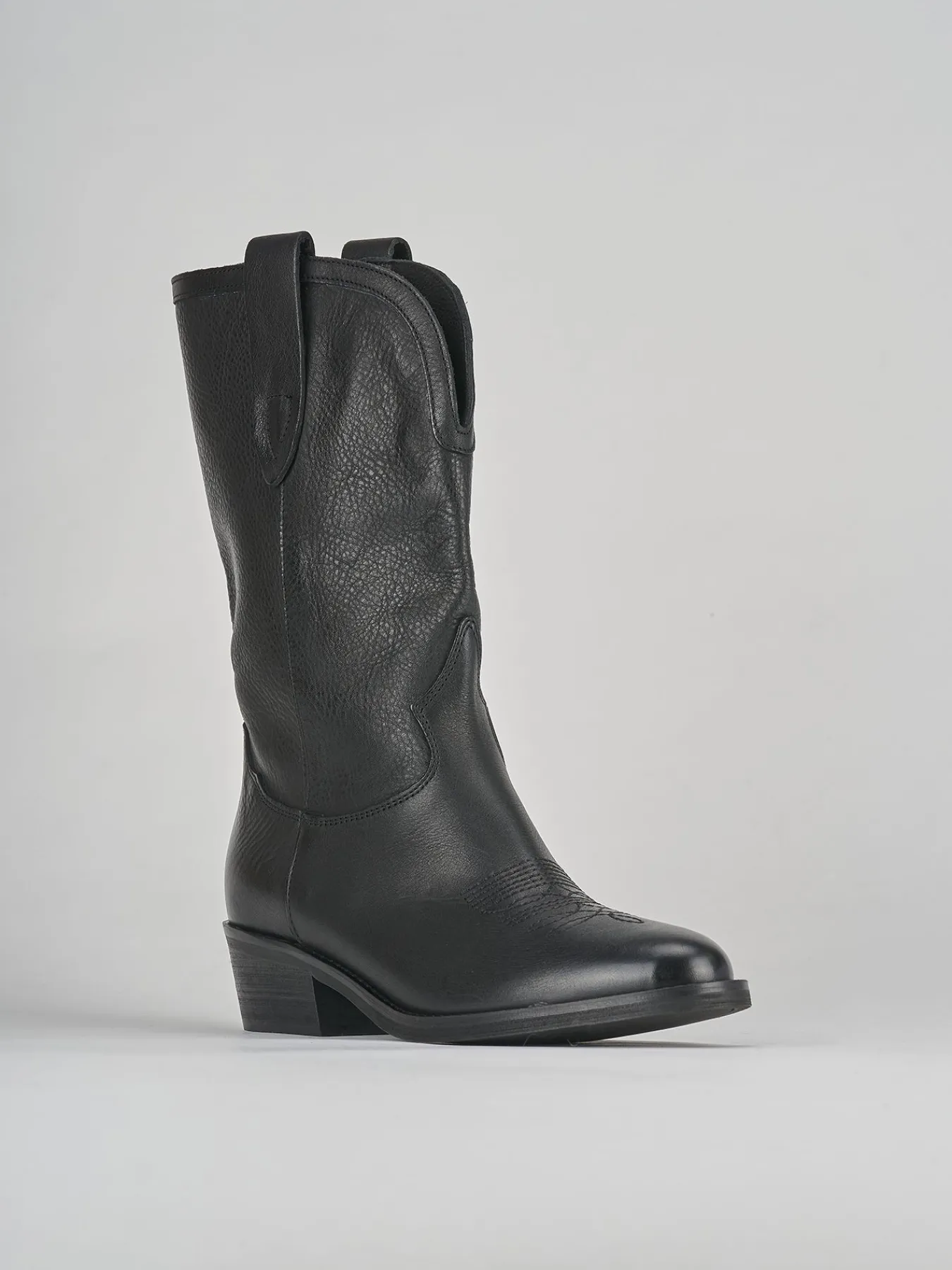 stivale texano tacco 4 cm, fondo in leggera gomma e soletto in vera pelle. tomaia in morbido vitello, punta tonda, ricami e altezza gambale a metà polpaccio con particolare svasatura anteriore per slanciare la tua figura.