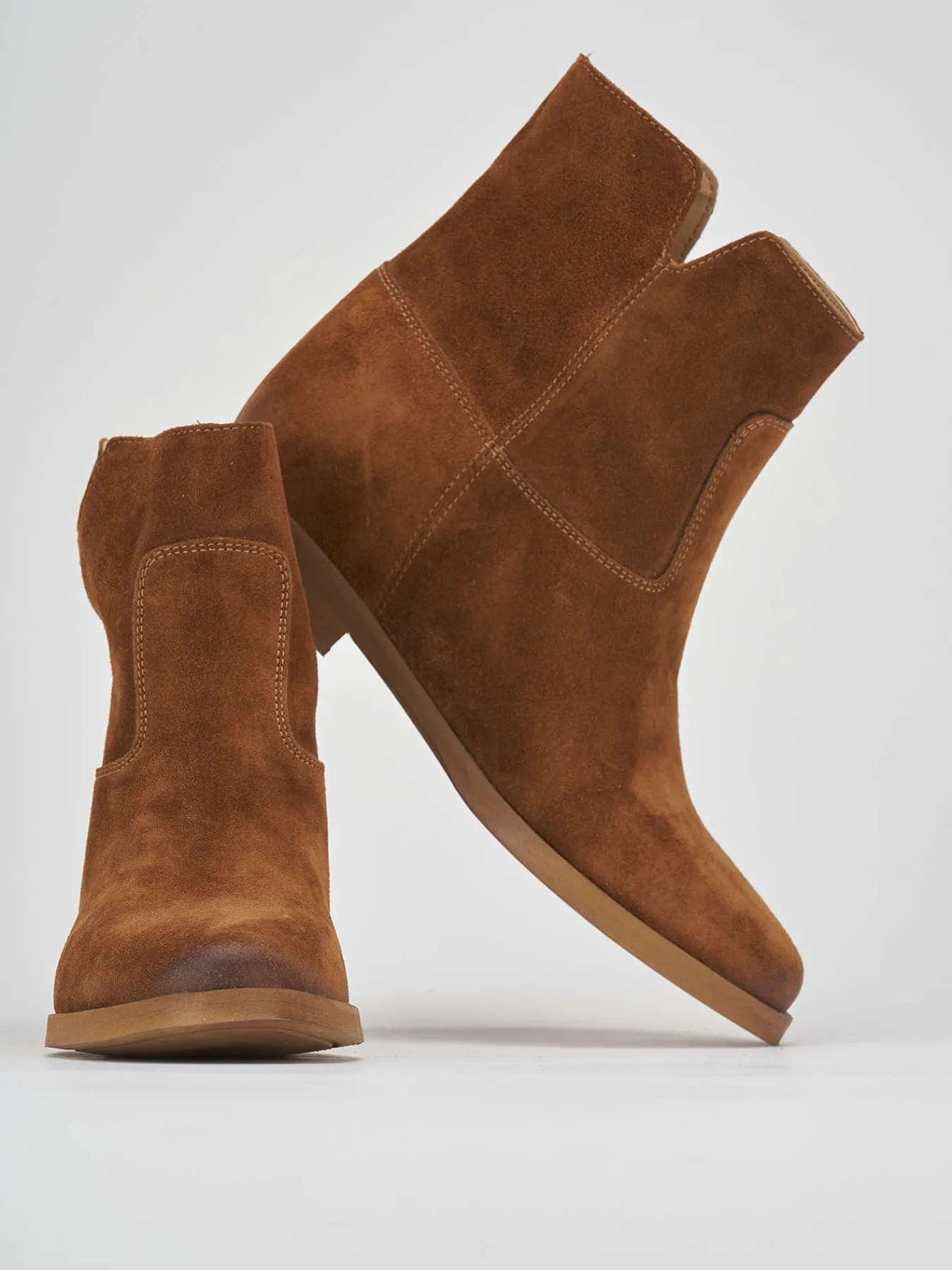 Stivaletto con zeppa interna 3cm e tacco 1.5 cm fondo in gomma e soletto interno in vera pelle. tomaia in morbida pelle scamosciata, punta tonda, cuciture fatte a mano e spacco laterale a ‘u’. scarpa passepartout e versatile per ogni tuo outfit.