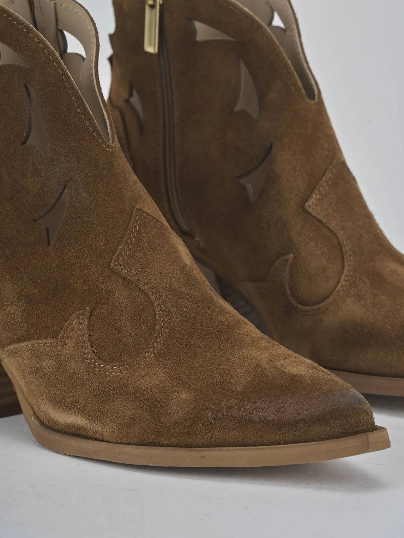 Stivaletto texano 5.5 cm fondo in gomma e soletto interno in vera pelle. Tomaia in morbida pelle scamosciata, punta sfilata, ghette, cuciture in rilievo, laserato, rapida chiusura con cerniera laterale e tacco cubano. Dal design ricercato, versatile con ogni tuo look.