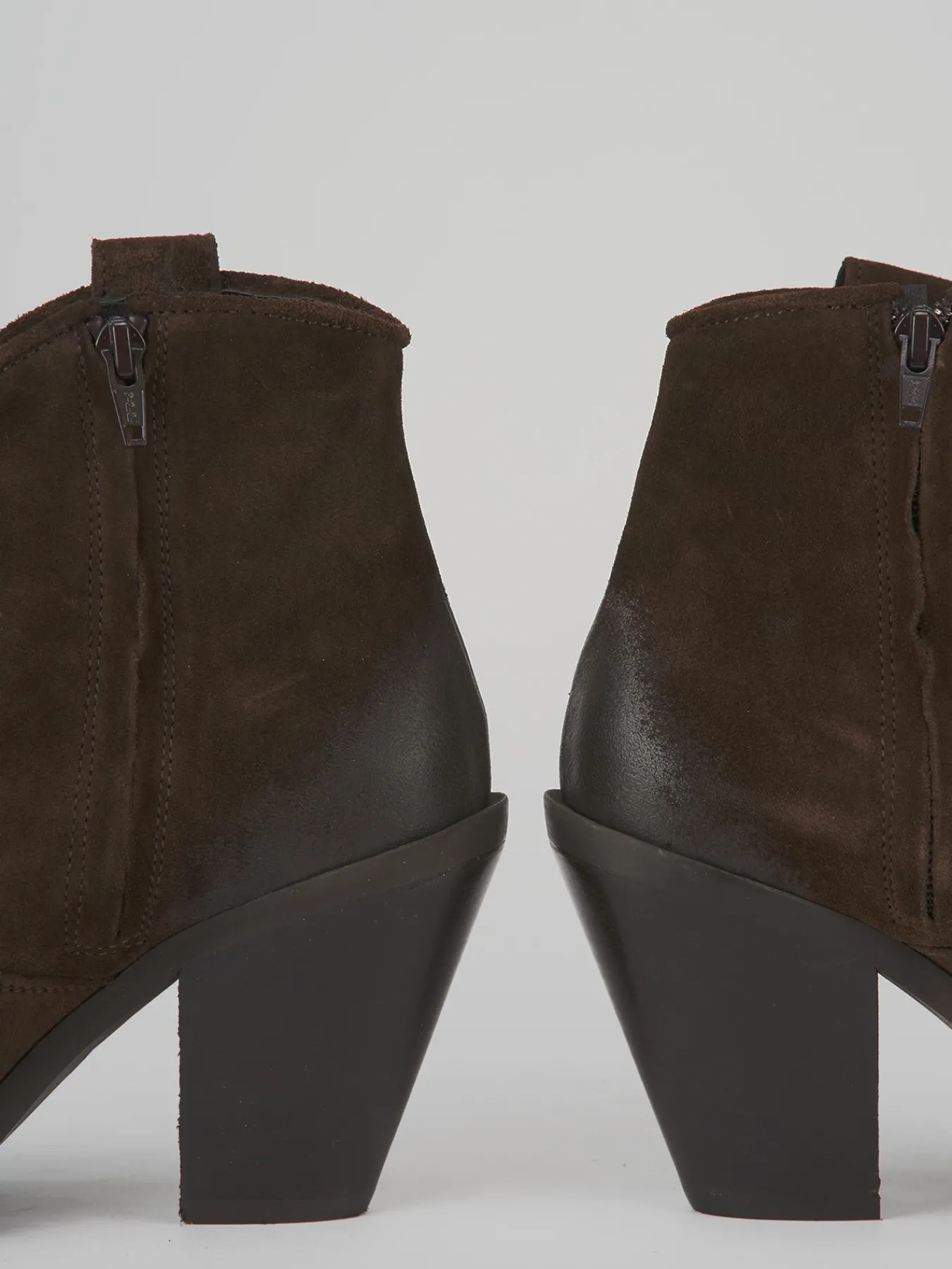 Stivaletto texano tacco 7 cm fondo in gomma e soletto interno in vera pelle. Tomaia in morbido camoscio, punta sfilata, cuciture visibili, guardolo sporgente, cerniera laterale, ghette e tacco in stile texano per un look estremamente cool adatto ad ogni tua occasione.