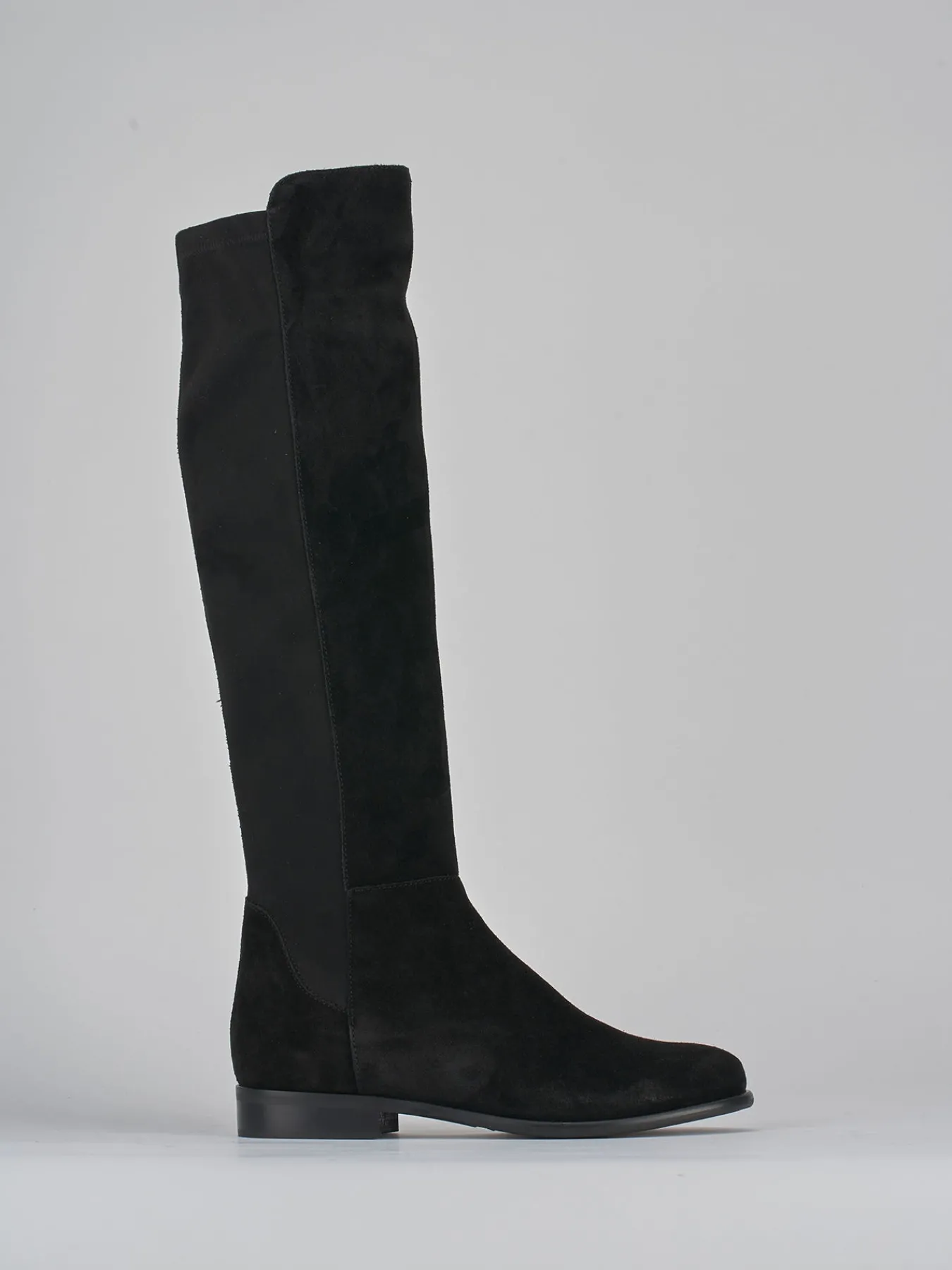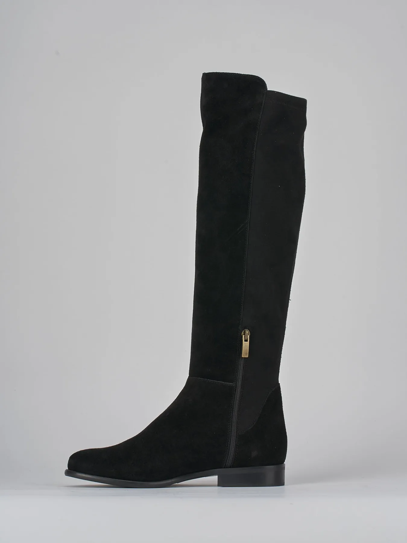 Stivale tacco 2 cm fondo in gomma e soletto interno in vera pelle. tomaia in morbido camoscio, punta affusolata, gambale tubolare con gambale elasticizzato per un fit unico per te. comoda cerniera laterale per un look perfetto. altezza gambale appena sotto ginocchio.