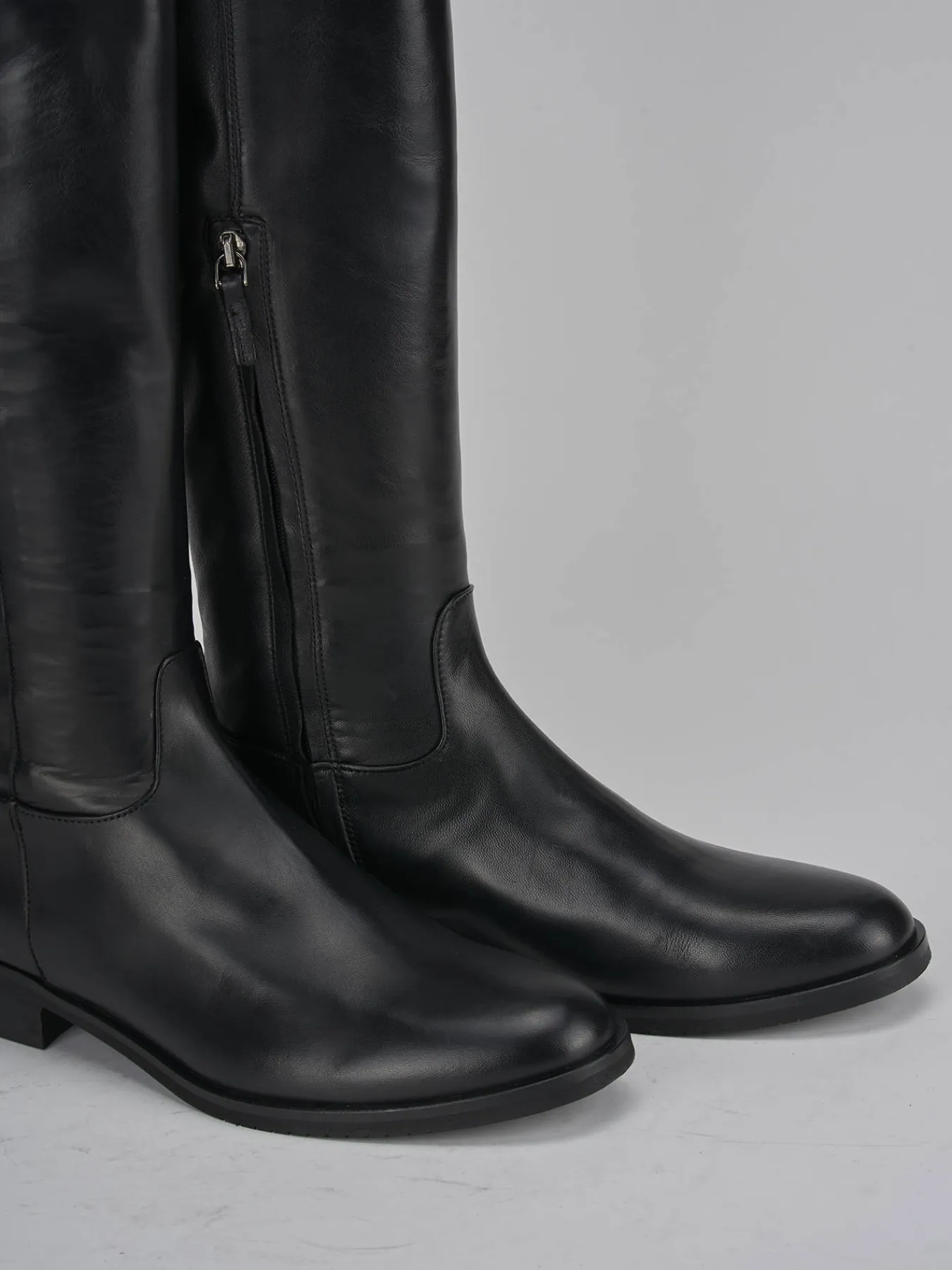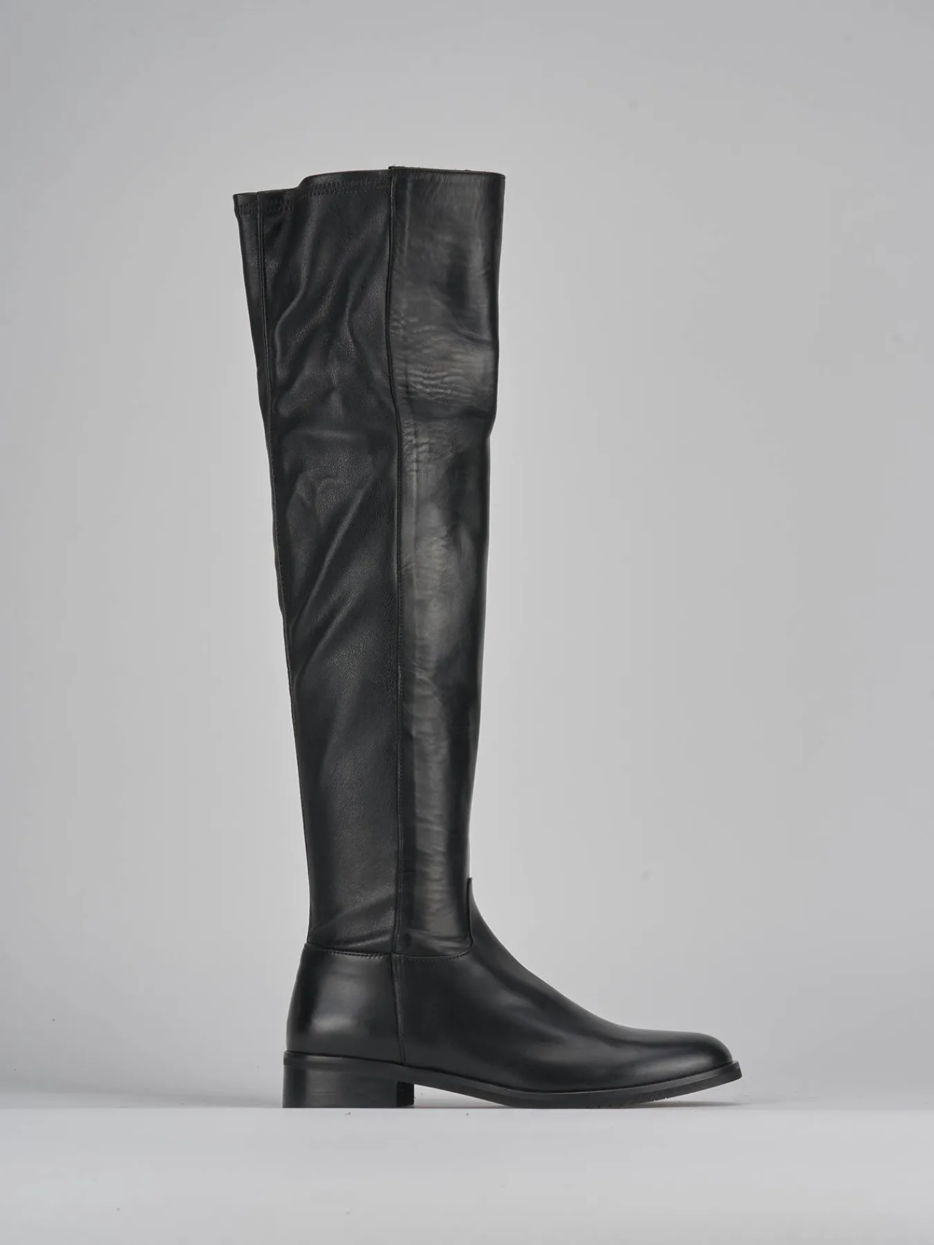 Stivale tacco 2 cm fondo in gomma e soletto interno in vera pelle. Tomaia in morbida pelle, punta arrotondata, cerniera laterale, cuciture ben visibili e gambale elasticizzato per un fit perfetto per un look che non passa mai di moda. altezza gambale appena sopra il ginocchio.
