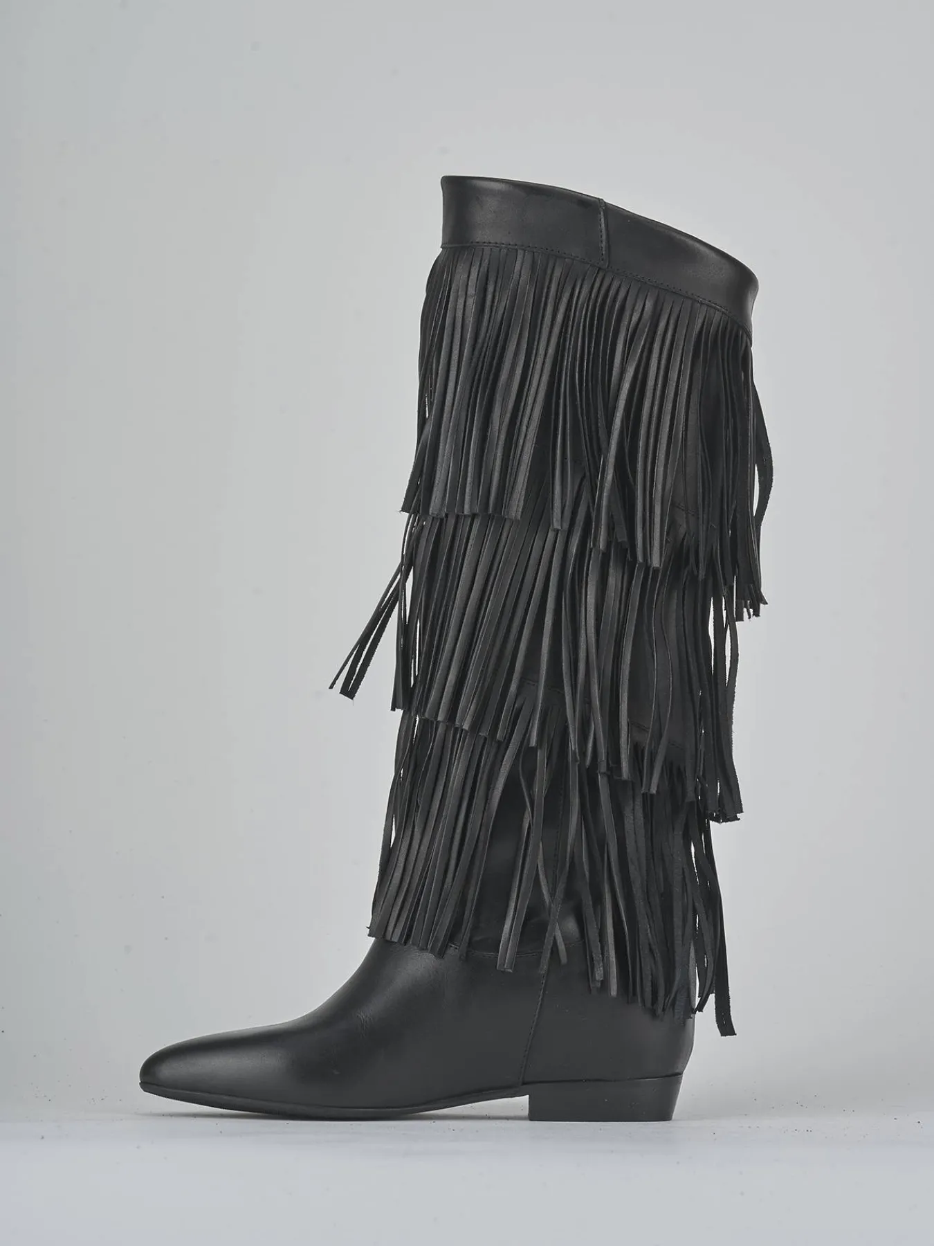 Le frange che adornano il gambale, che arriva appena sotto il ginocchio, aggiungono un tocco di originalità e movimento al tuo outfit.