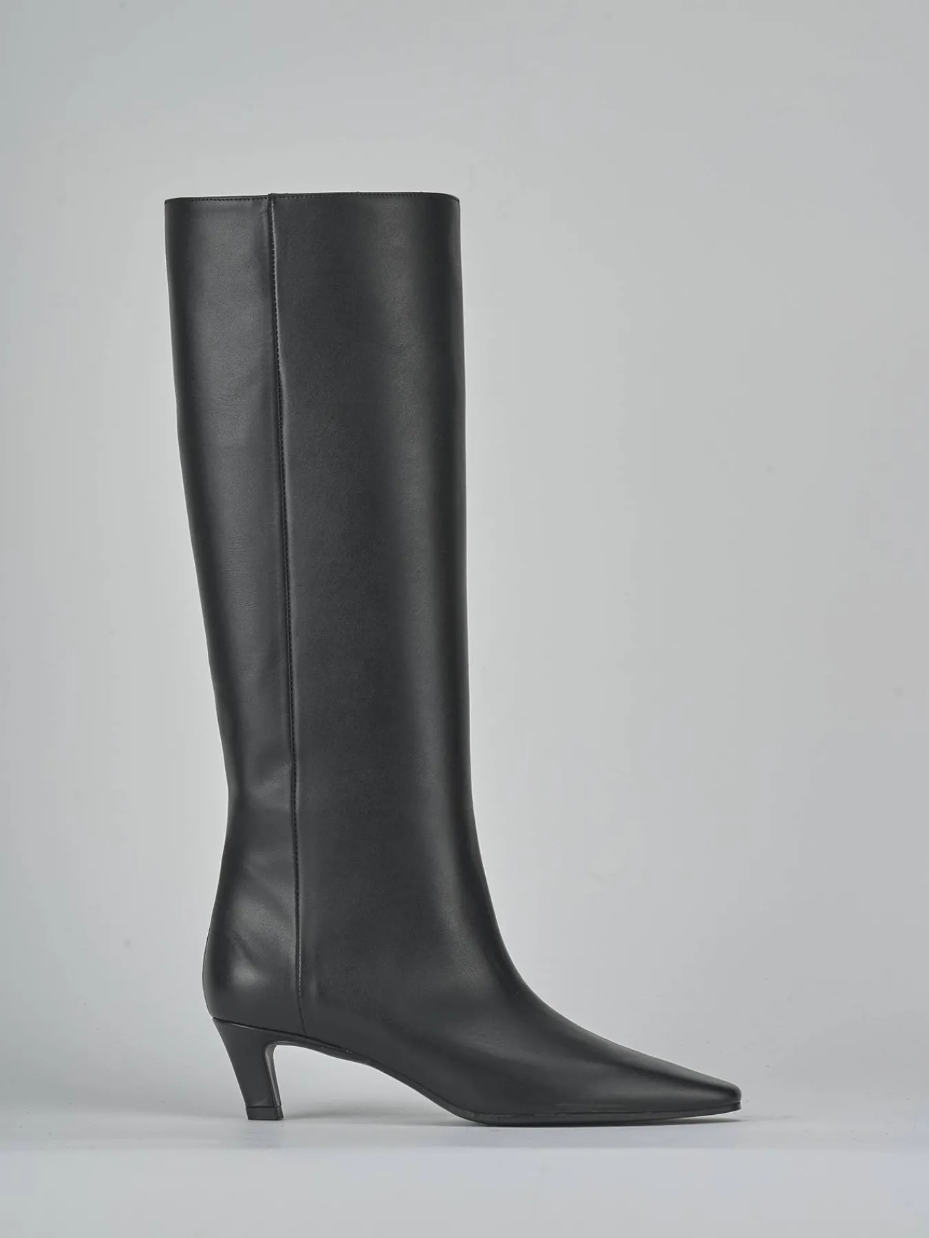 Il design presenta una punta sfilata e cuciture visibili a mano sul gambale tubolare, che arriva appena sotto il ginocchio.