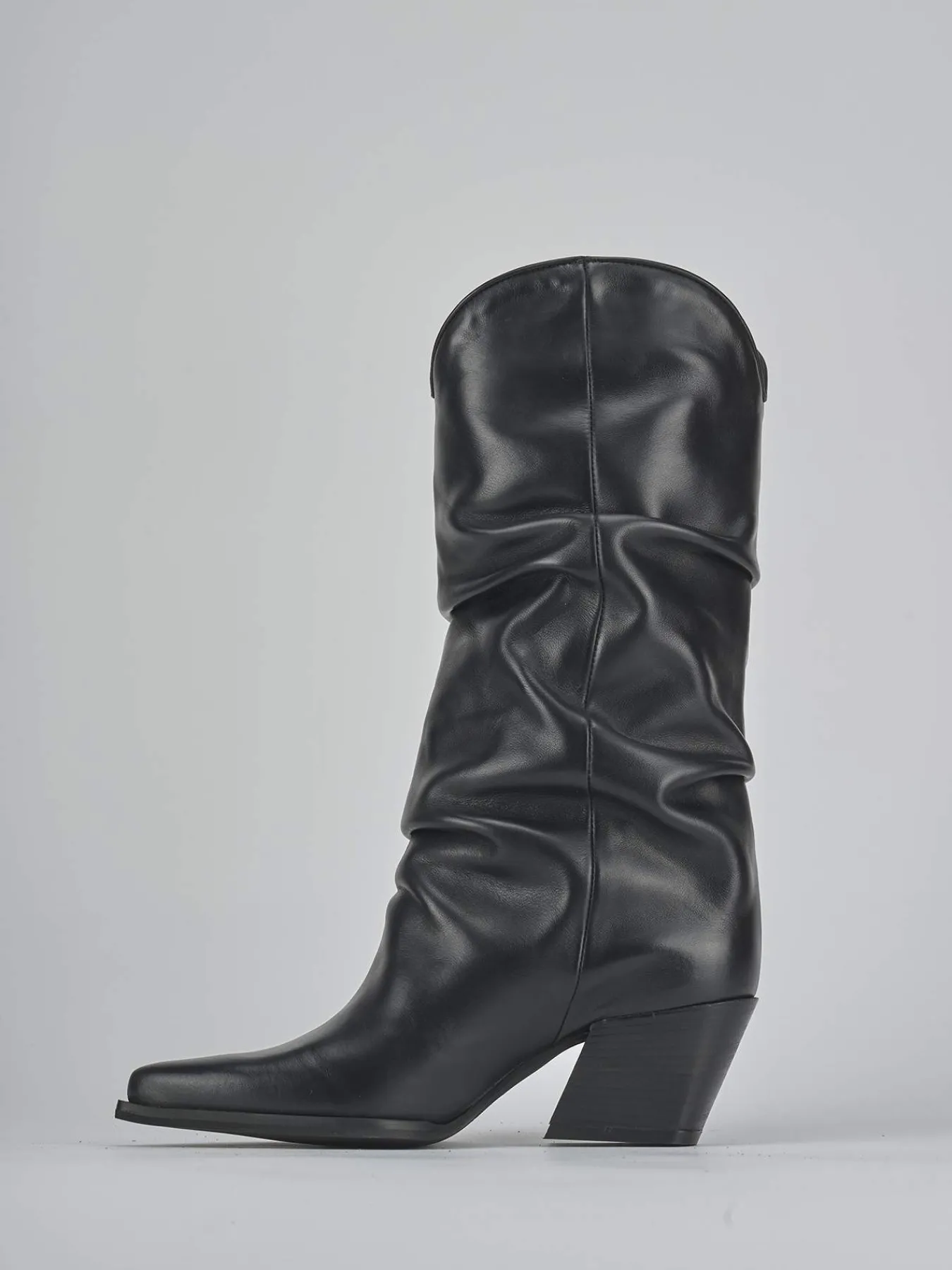 Stivale texano tacco 6 cm fondo in gomma e soletto interno in vera pelle. Tomaia in morbida pelle, punta sfilata, cuciture a mano sul gambale che misura appena sotto il ginocchio. Tomaia arricciata, aprtura savasata frontalmente e tacco cubano per un look cool.