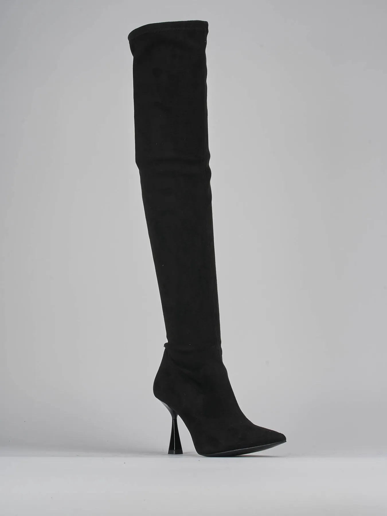 stivale tacco 9 cm fondo in leggera gomma e soletto interno in vera pelle. tomaia in morbido camoscio, punta sfilata, gambale ampio e tubolare che misura appena sopra il ginocchio. comodo tacco rocchetto in materiale abs per un look cool.