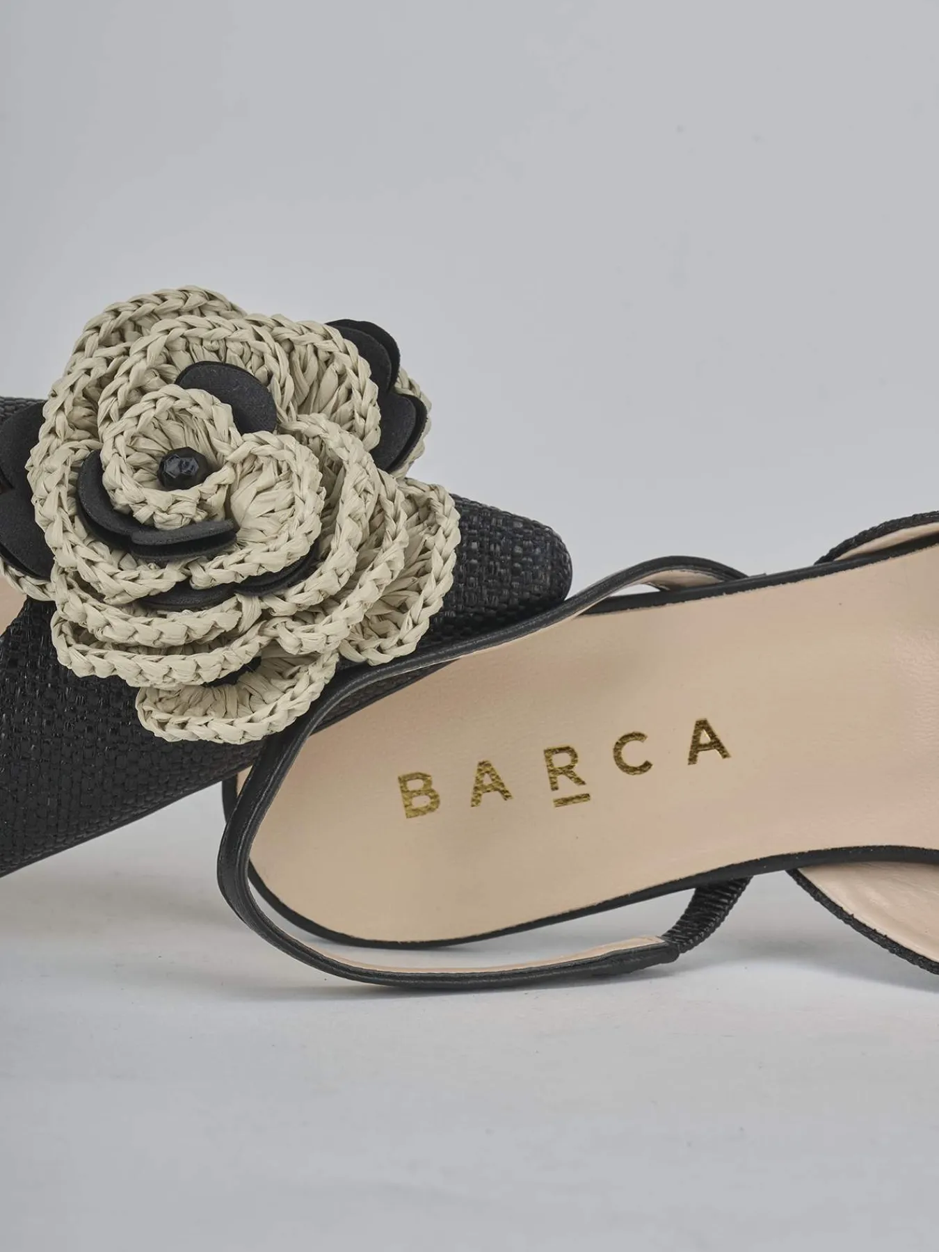 Ballerina tacco 2 cm fondo in leggerissima gomma e soletto interno in vera pelle. Tomaia in morbida pelle foderata di rafia, punta sfilata, scollo morbido a ‘U’, accessorio floreale, cinturino elasticizzato e tacco a cono stabile. Per le tue occasioni più speciali.