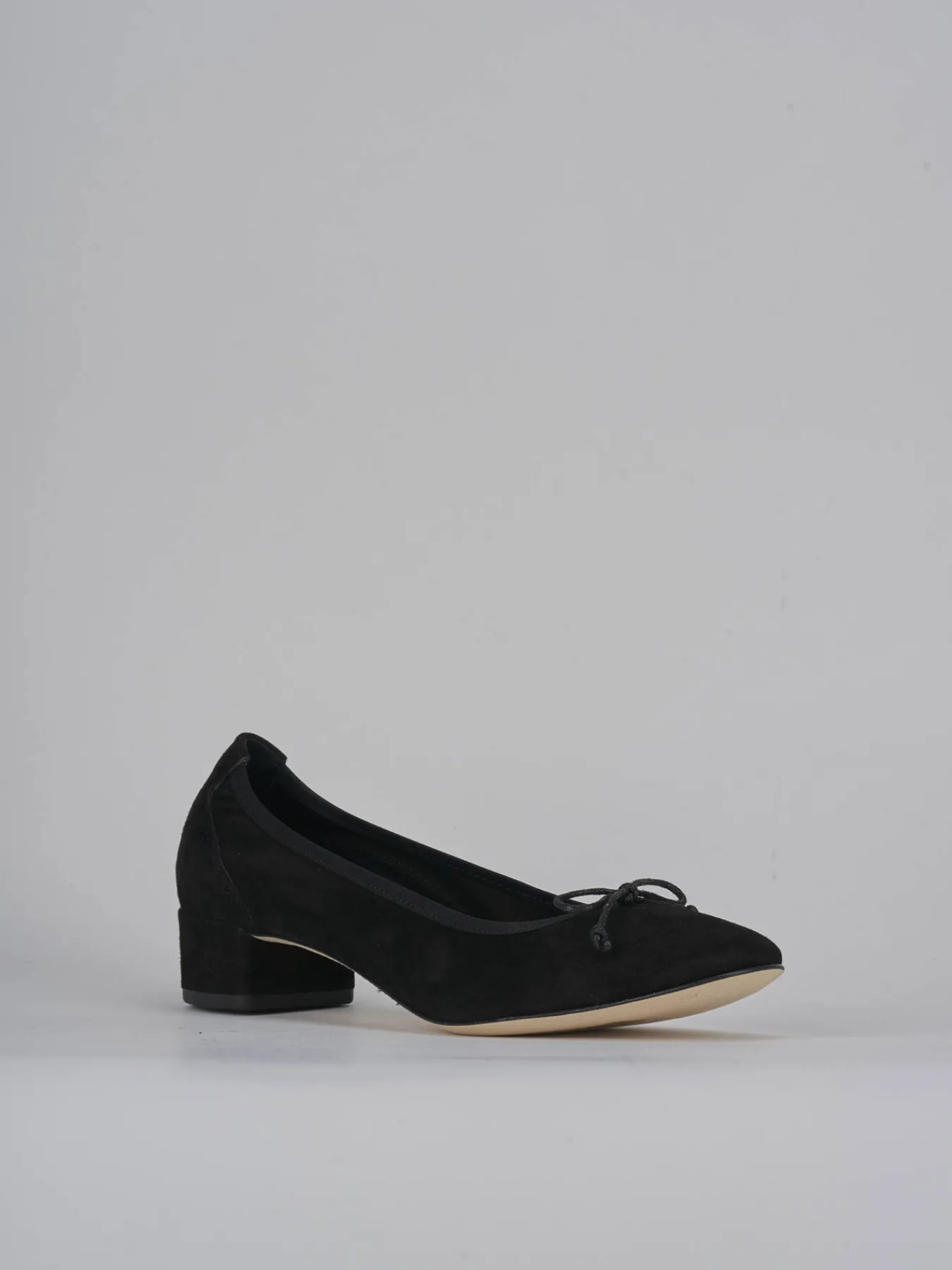 Ballerina tacco 3.5 cm fondo in cuoio e soletto interno in vera pelle. tomaia in morbido camoscio, punta tonda, fiocco in punta, bordi in tessuto ton sur ton elasticizzati per il massimo del comfort. Tacco grosso comodo. Perfetto per le tue occasioni più speciali.