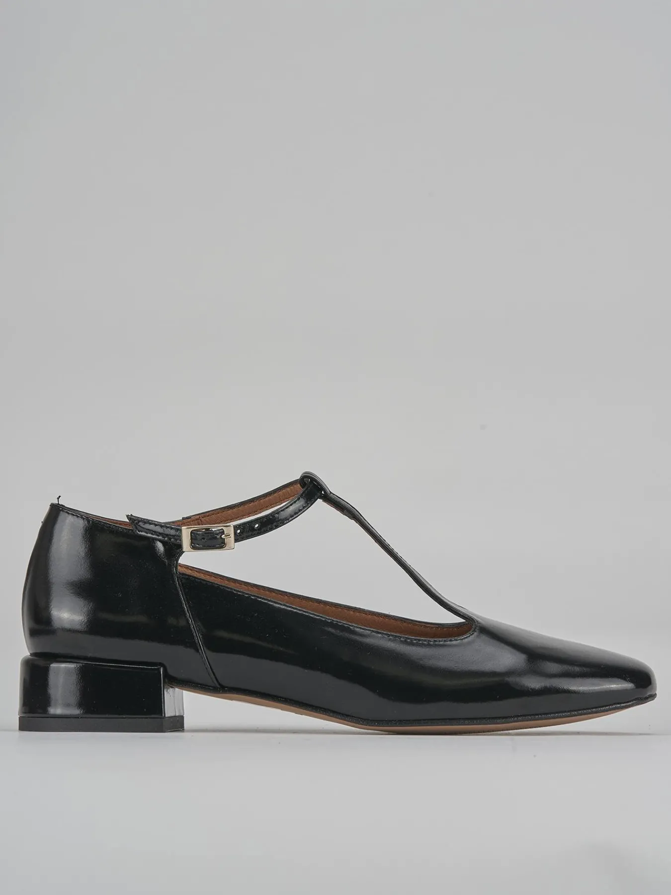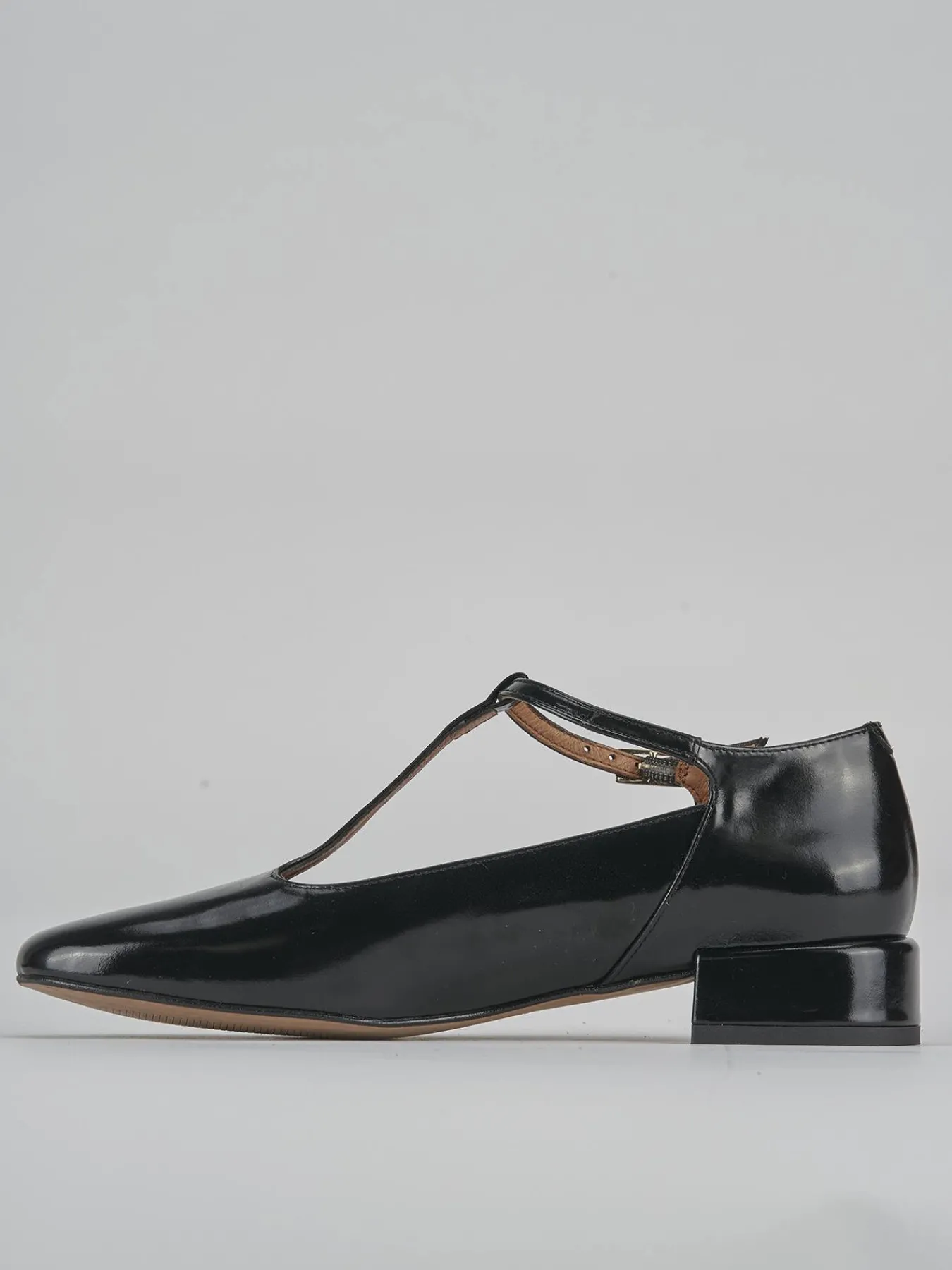 Il design presenta una punta leggermente squadrata e liscia, con un cinturino a ‘T’ sul collo del piede dotato di fibbia regolabile per un fit personalizzato.