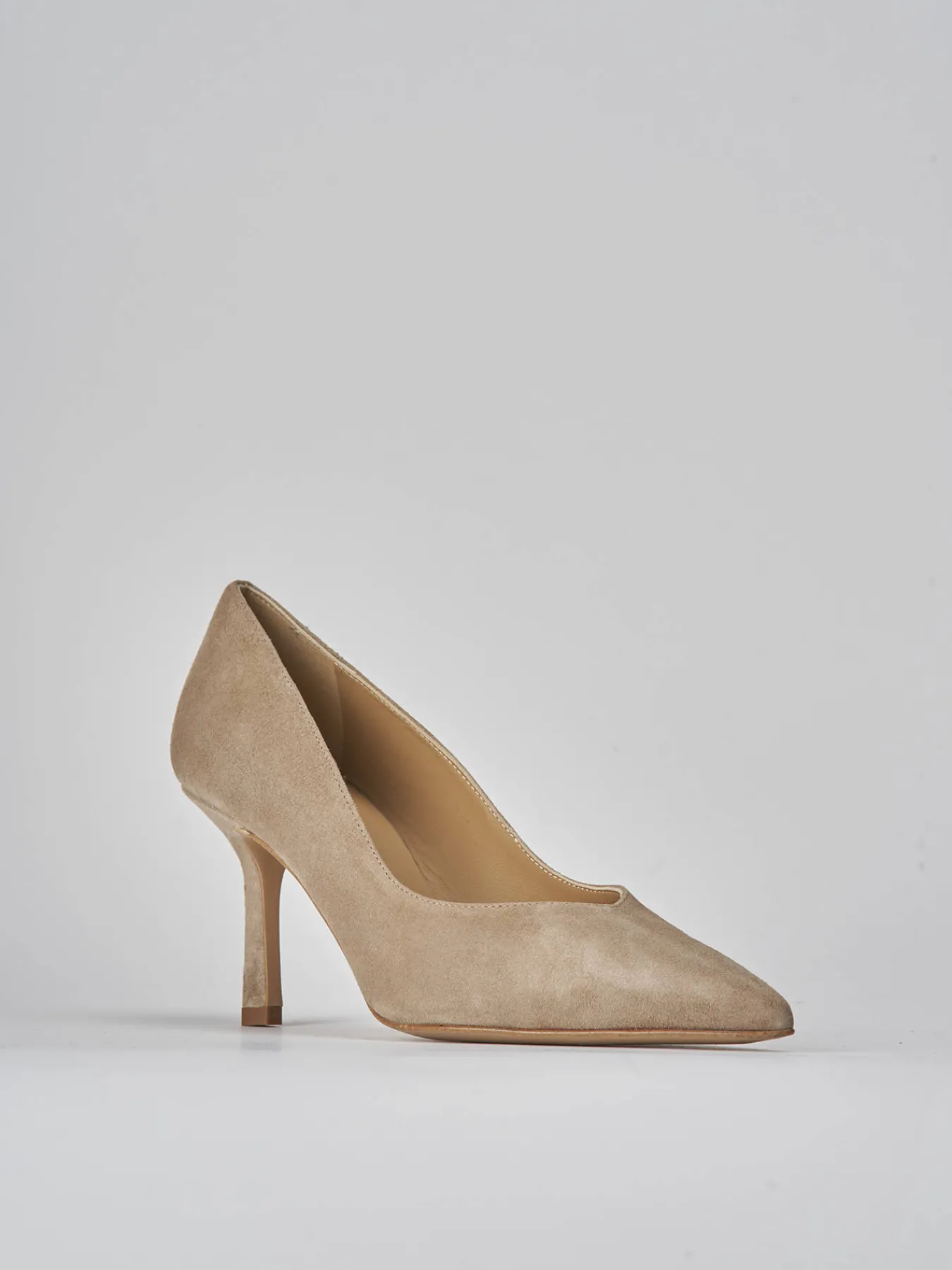 Decolte’ tacco 7 cm fondo in cuoio e soletto interno in vera pelle. tomaia in morbido camoscio, punta sfilata, scollo a ‘V’, liscio e tacco fino. Dalle linee sempre eleganti e decise, perfetto sia con un jeans che con una gonna.